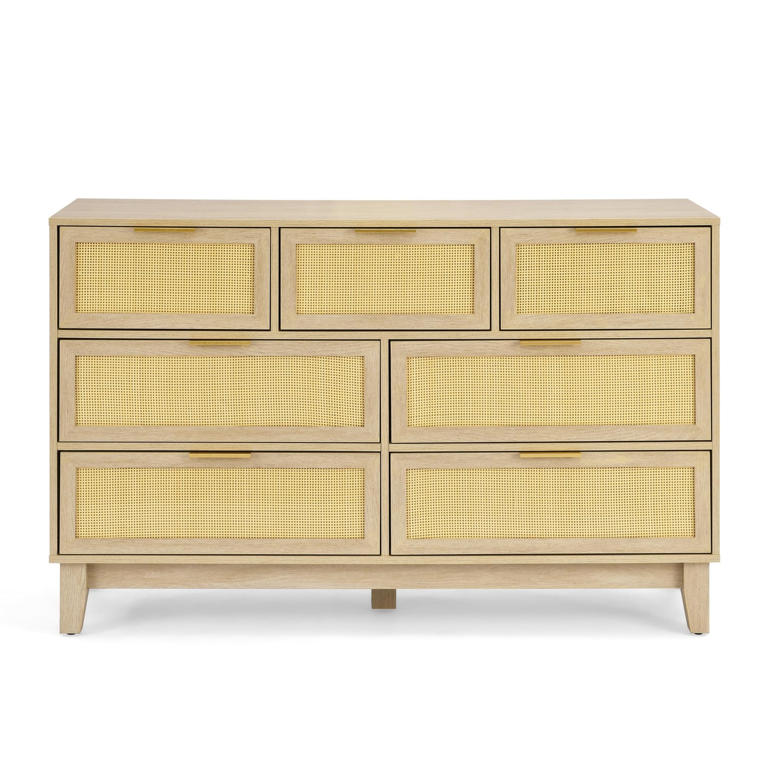 SEHAONOHOME Rattan Dresser with 7 Drawers, Wooden Modern Chest of Drawers, Wood Storage Cabinet for Bedroom, Entryway, Living Room and Hallway, Natural Wood