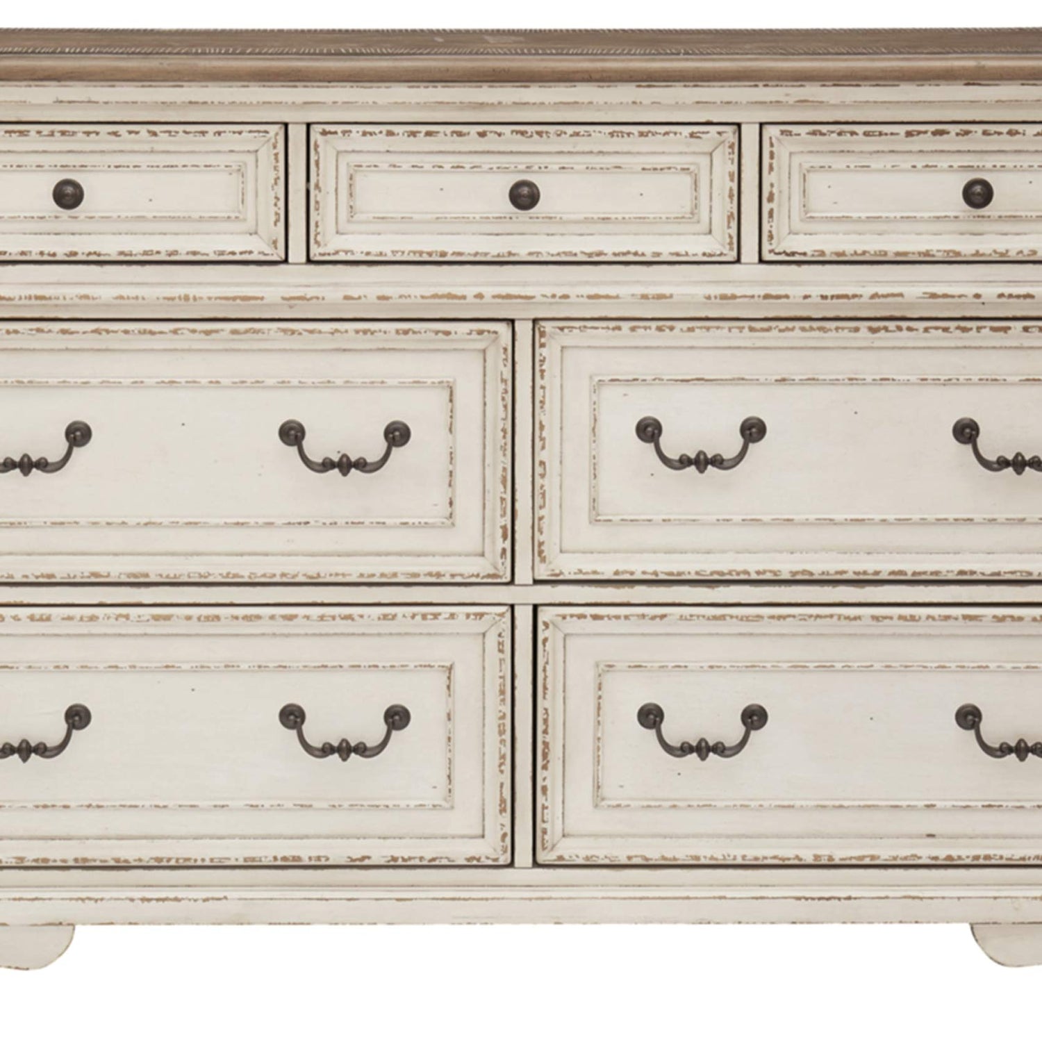 Details: Elevating the art of traditional cottage styling, this dresser is your dream bedroom retreat realized. Antiqued two-tone aesthetic blends a chipped white with a distressed wood finished top for added charm. Framed drawer fronts and decorative corbels add refinement, while bail pulls in a dark bronze-tone finish lend a classic touch. Whether you need storage space for clothes, linens or toys, you're sure to find the right fit. Your dream bedroom is closer than you think–our wide selection of finishes and features fulfill your decor needs, from casual to contemporary. And we go the extra mile to package, protect and deliver your purchase in a timely manner.
