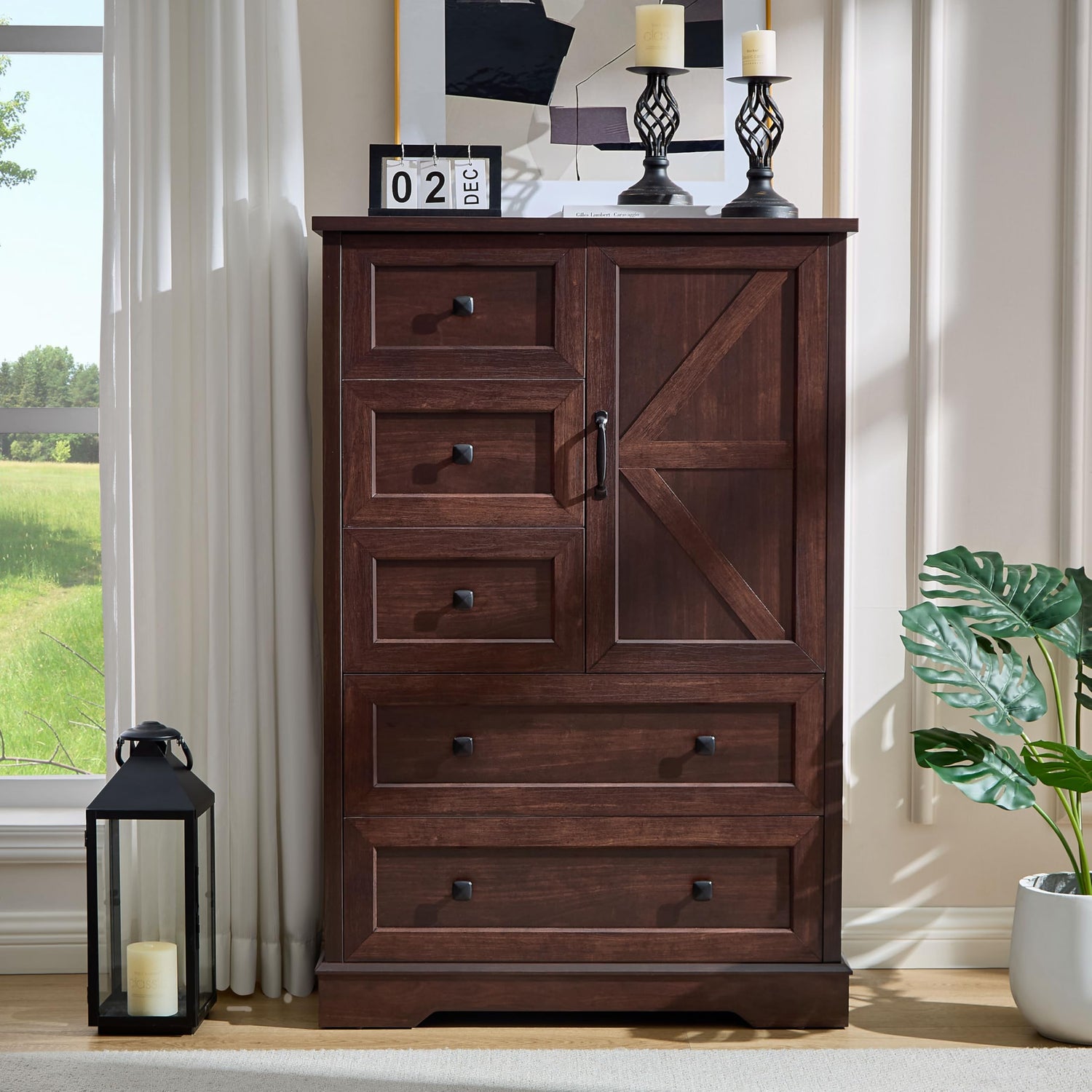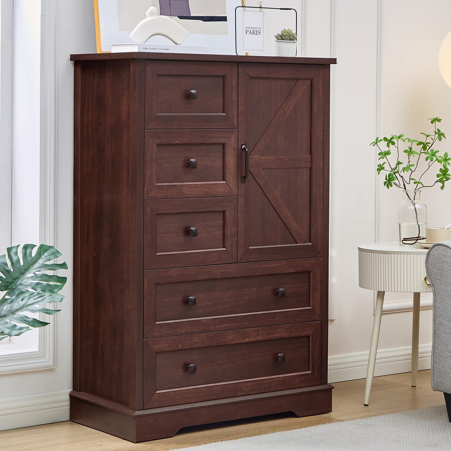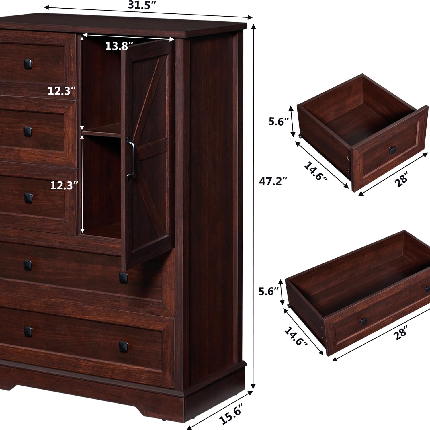 - Ample Storage Space: Standing at 31.5" W x 15.6" D x 47.2" H, this cherry wood dresser offers generous storage with 2 large drawers, 3 small drawers, and a double-layer cabinet to accommodate all your organization needs.
