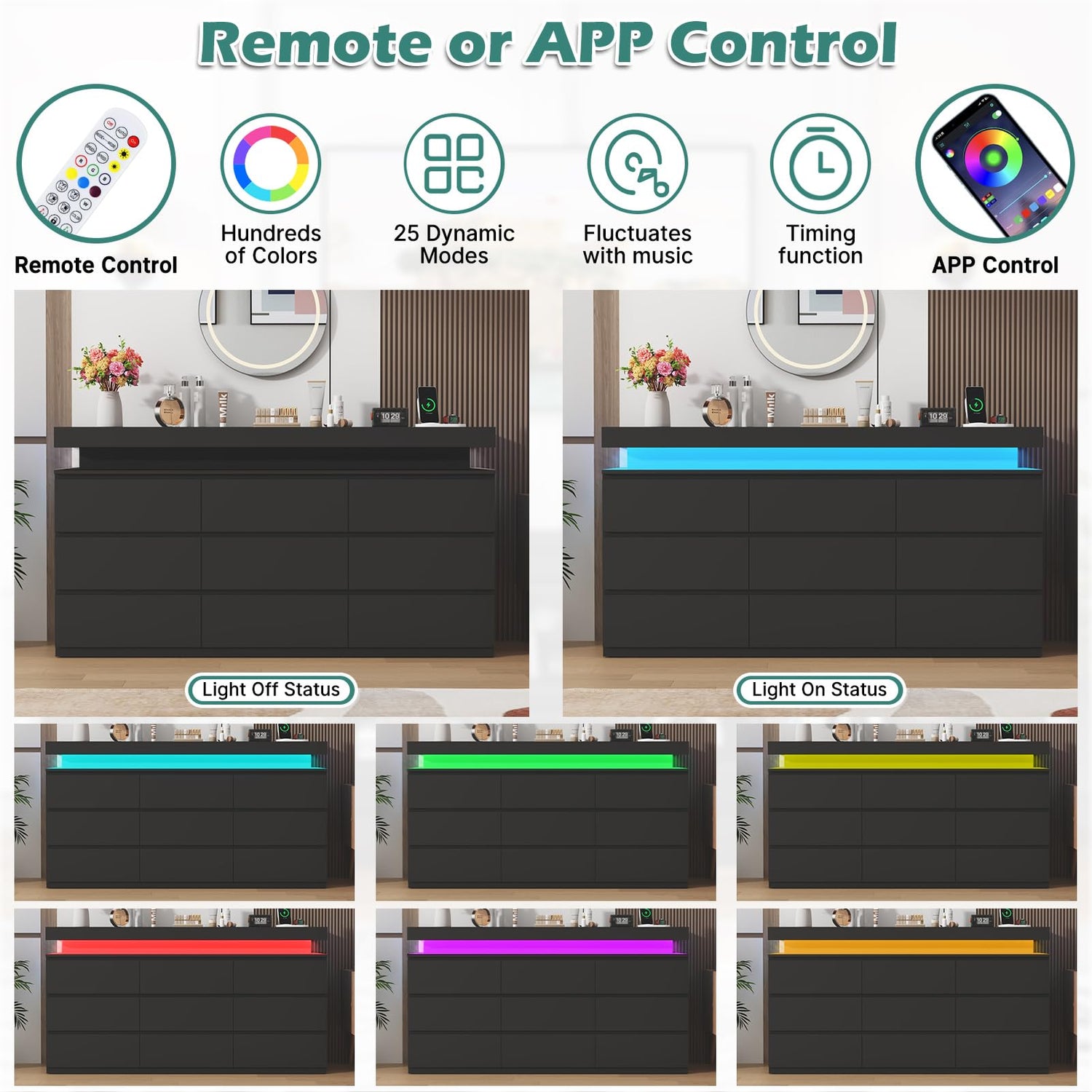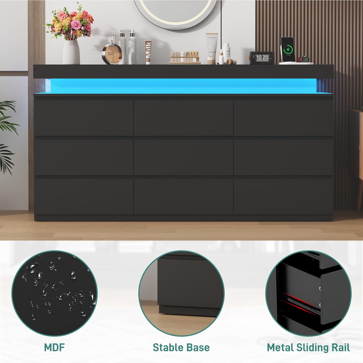 St.Mandyu 9 Drawer Dresser with Power Outlet, 63" Wide Dresser with LED Light, Modern Chest of Drawers for Closet, Double Drawer Organizer Cabinet for Bedroom, Living Room, Black