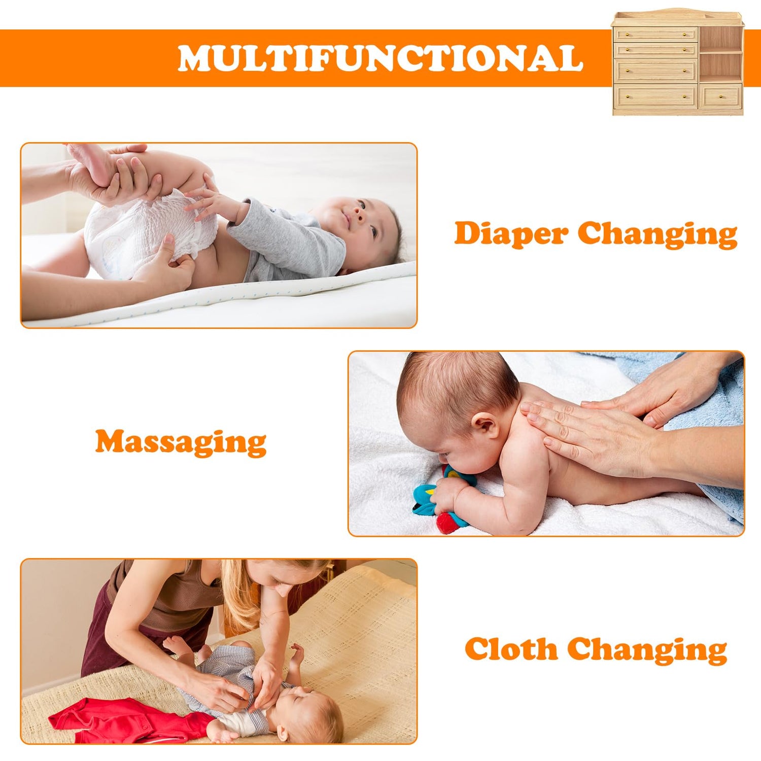 - Multifunctional: Our diaper baby dresser is versatile and suitable for various occasions, whether it is a bedroom or a nursery. It provides functions such as diaper changing, massage and changing clothes. As the baby grows, the top table can be removed and used as a regular kids dresser with 5 drawers