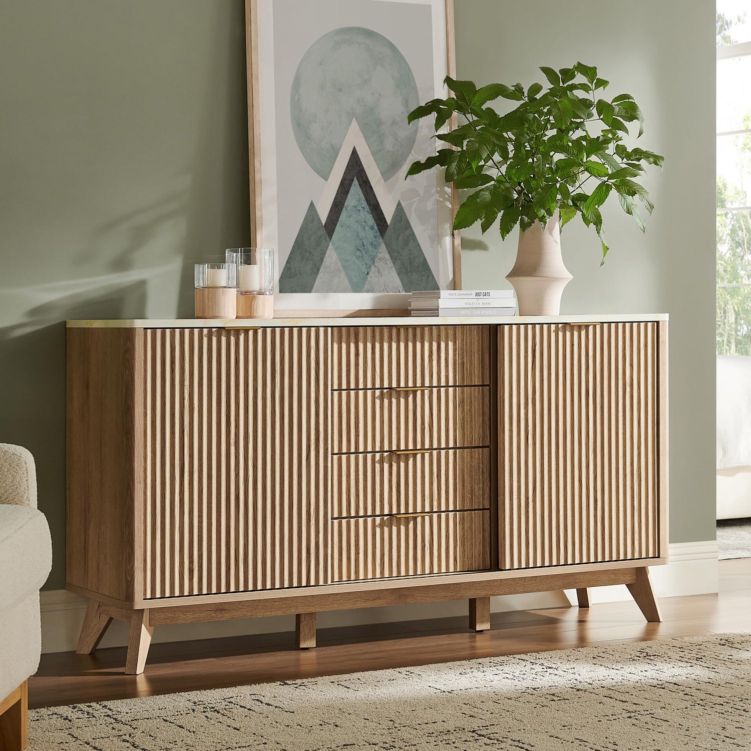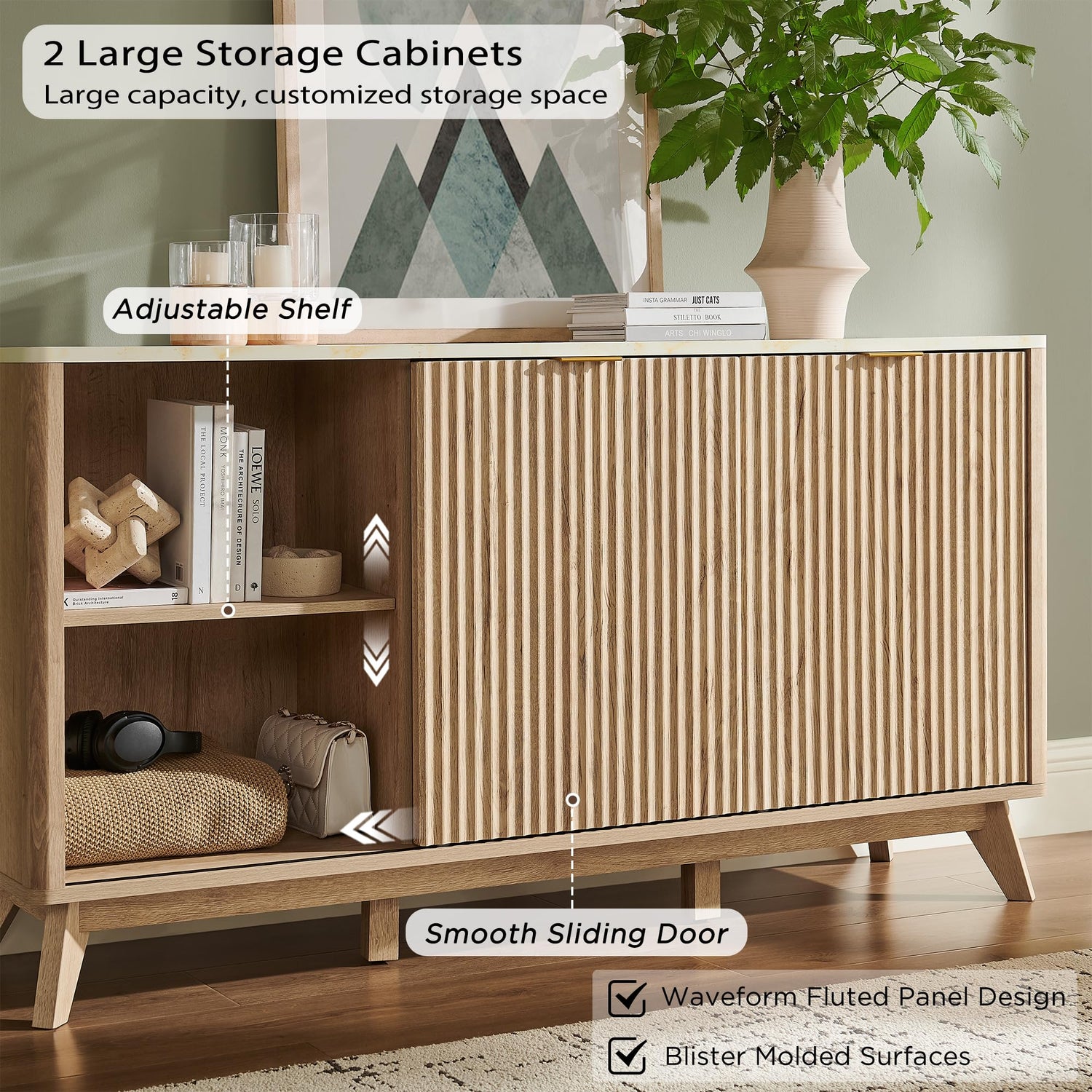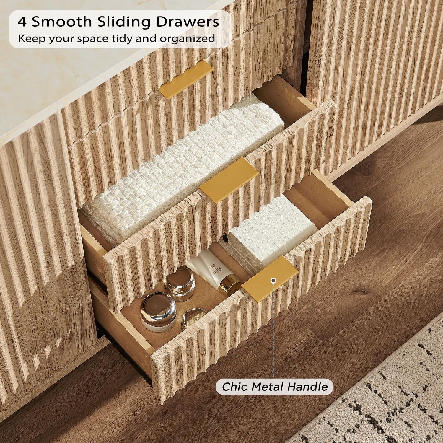 - Timeless Elegance Meets Modern Chic: The distinctive wave-like fluted panel enhances the texture and spatial presence of this exceptional piece. The off-white faux marble top, adorned with earth-toned veins, complements the natural oak finish, while the smooth curved edge exudes an aura of elegance and provides a safe environment for little ones. The wide metal handle and splayed legs add to its contemporary vibe, creating a personalized and distinctive aesthetic.