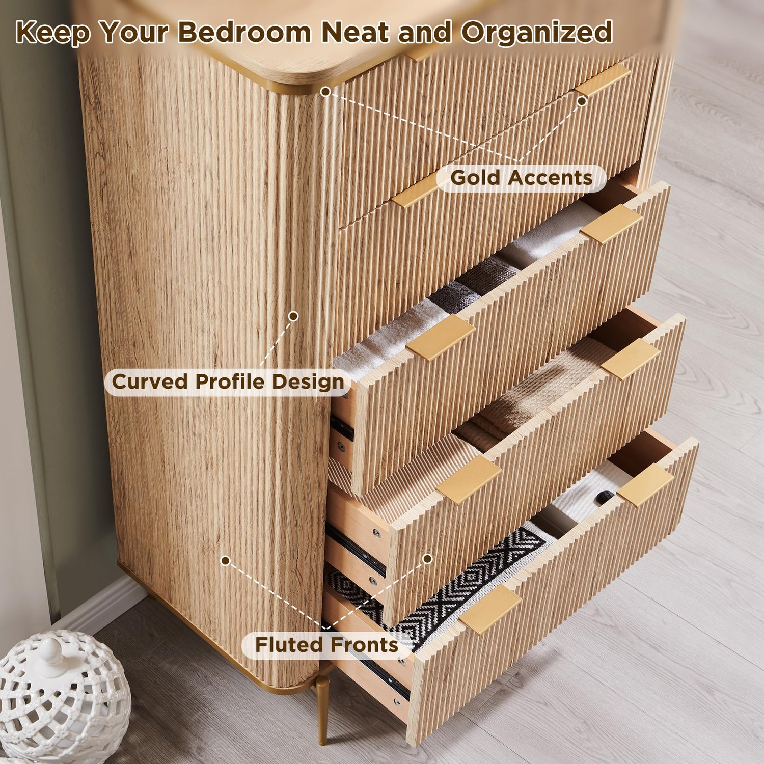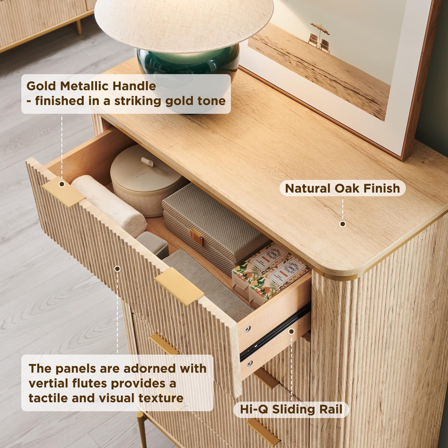 T4TREAM Fluted 5 Drawers Dresser for Bedroom, 48" Tall Modern Dresser Chest of Drawers, Gold Accents, Fluted Fronts, Wood Storage Dressers Organizer for Bedroom, Living Room, Natural Oak