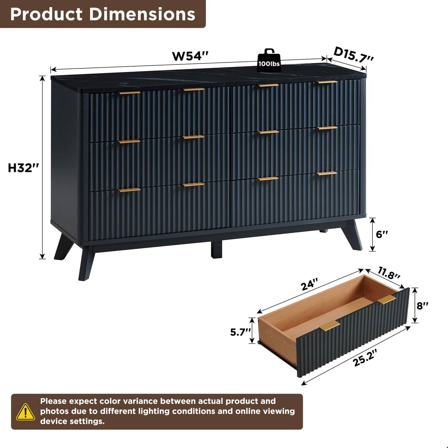 - Versatile, Stylish Dresser: Measuring 54"W × 15.75"D × 32"H, this dresser offers an array of possibilities for your home organization. Its spacious tabletop serves as a stylish canvas to beautifully showcase framed photos, artistic accents, and more. It features 6 smooth-glide drawers, offering efficient storage solutions. Keep your space neat and tidy by conveniently stowing clothing, bedding, cosmetics, jewelry, and more. Perfect for bedroom, living room, hallway, entryway.