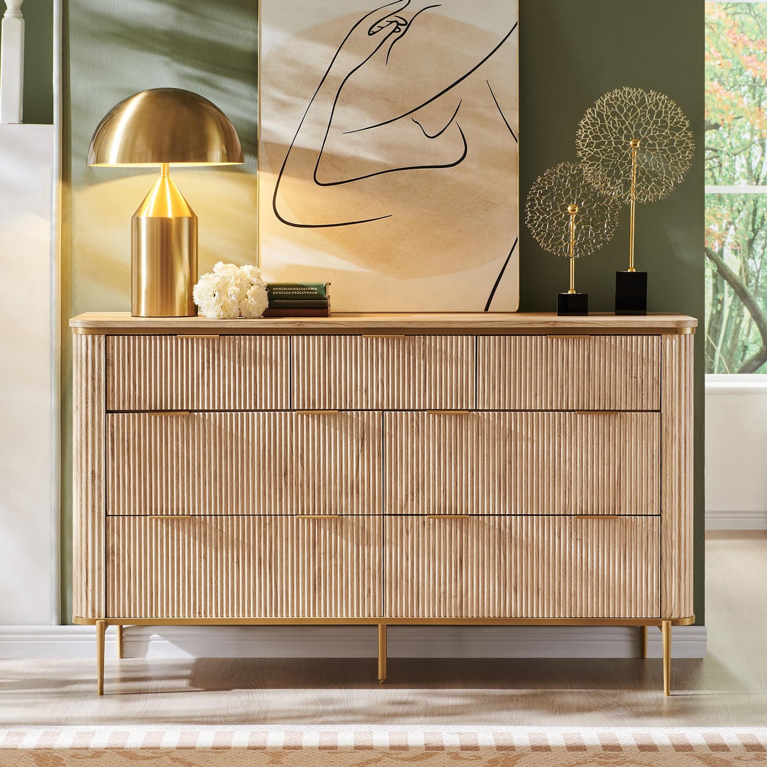 T4TREAM Fluted 7 Drawers Dresser for Bedroom, 54" Wide Modern Dresser TV Stand, Gold Accents, Fluted Fronts, Wood Storage Dressers Organizer for Bedroom, Living Room, Natural Oak