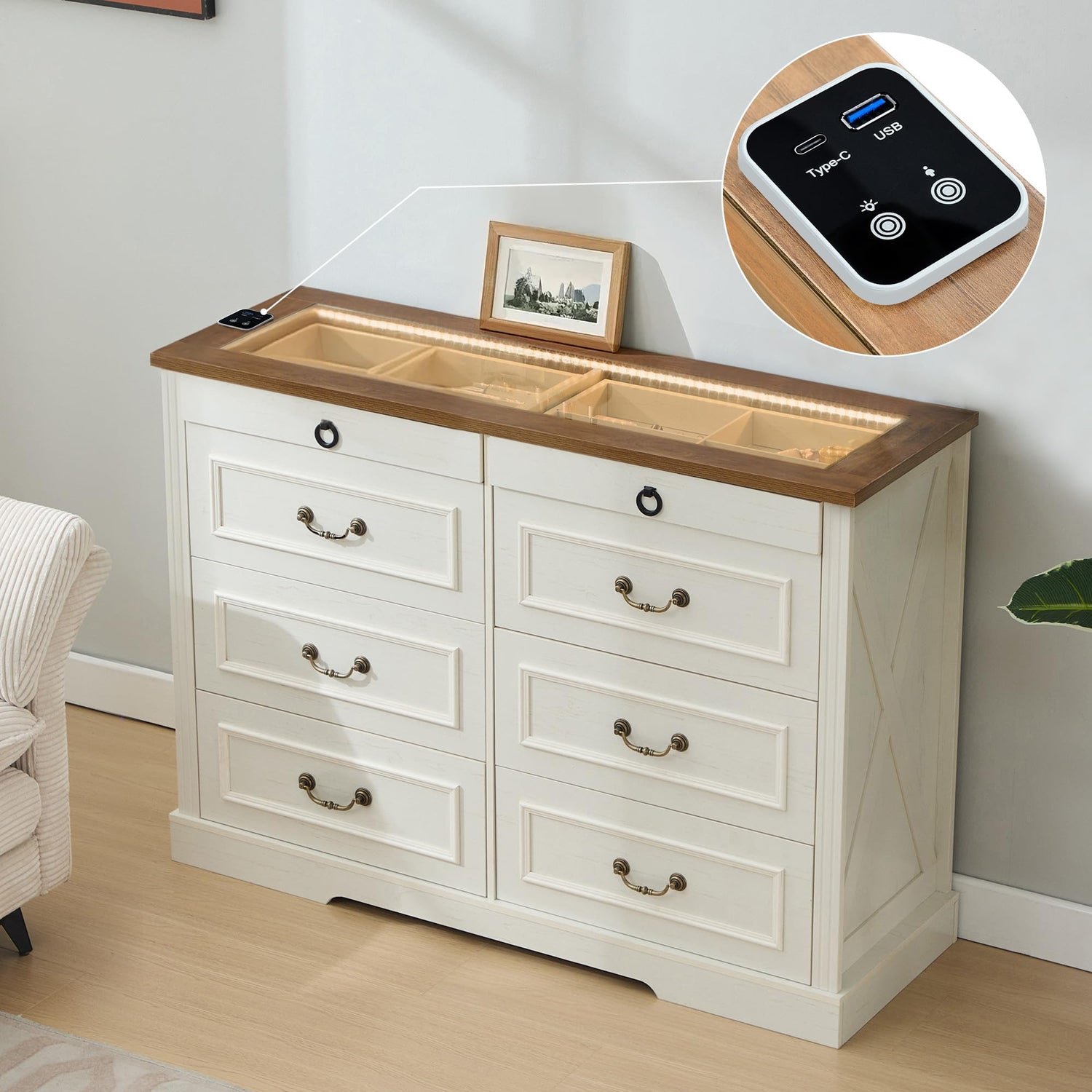 Tltaroni Farmhouse 8 Drawer Dressers, Wooden Chest of Drawers with Glass Top LED Light Charging Station Human Sensor Storage Organizer for Living Room Bedroom and Hallway, Antique White