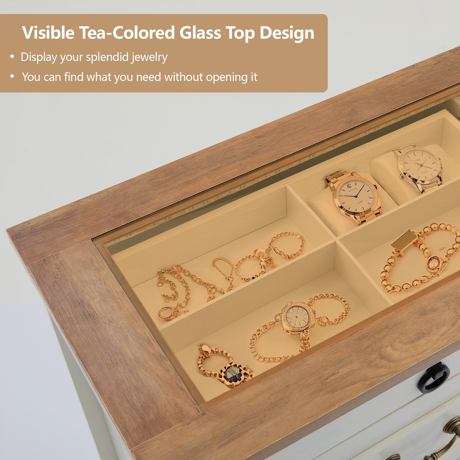- 【LED Tea-Colored Glass Desktop】This 8 drawers dresser with led lights farmhouse 8 drawer dressers for bedroom features a tea-colored tempered glass top with led lights (the LED lighting offers three color modes: warm light, natural light, and white light). The chest of drawers glass top has 2 visible grid drawers, when the lights are on, the tea-colored tempered glass top showcases exquisite jewelry, watches, cosmetics, and decorations; when the lights are off, it provides privacy, offering you an ultimate user experience