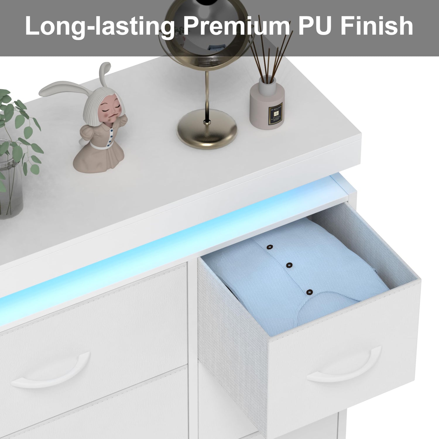 Tohomeor TV Stand 9 Drawer Dresser with Power Outlet LED Lights, Modern Chest of Drawers Fabric Drawers with PU Finish Small TV Console Table Dresser for Living Room (White, 9 Drawers)