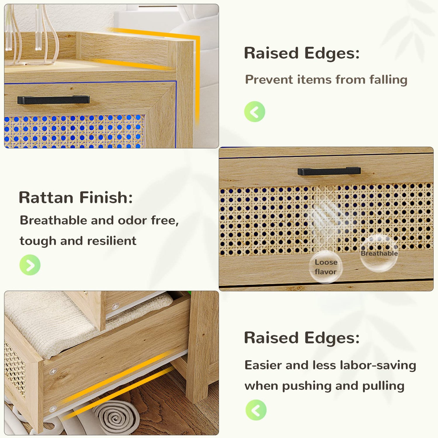 - 【Rattan Dresser with LED Lights】The RGB LED lights of the chest of drawers have dozens of color modes, you can change their color and brightness through a mobile App or button. Connect to Bluetooth to play music, and the LED lights can freely switch colors according to the rhythm of the music. This LED dresser can enrich your bedroom space and can also be used as a night light to avoid darkness.