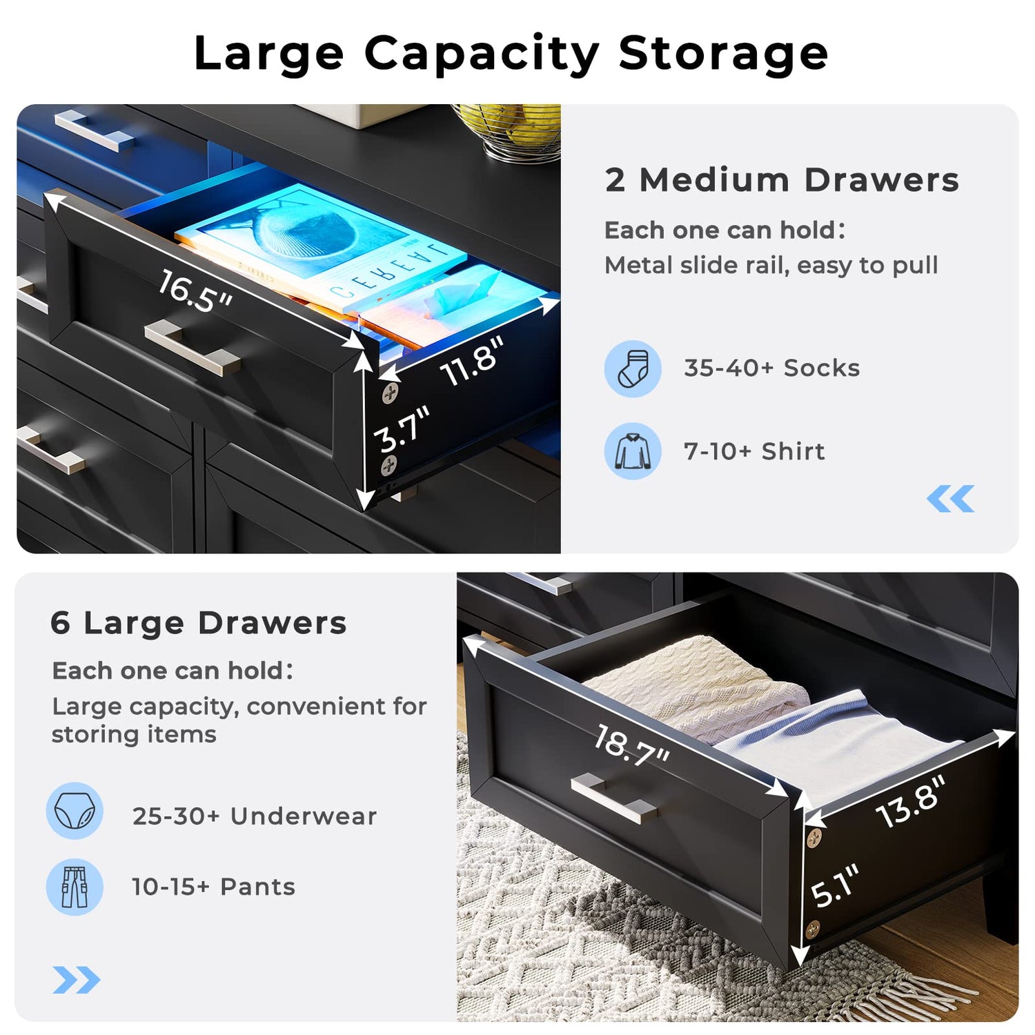 VIAGDO Dresser for Bedroom with 8 Drawers, Chest of Drawers with LED Light, Tall Wide Dresser for Storage and Organization, Black Dresser for Bedroom, Living Room, Closet