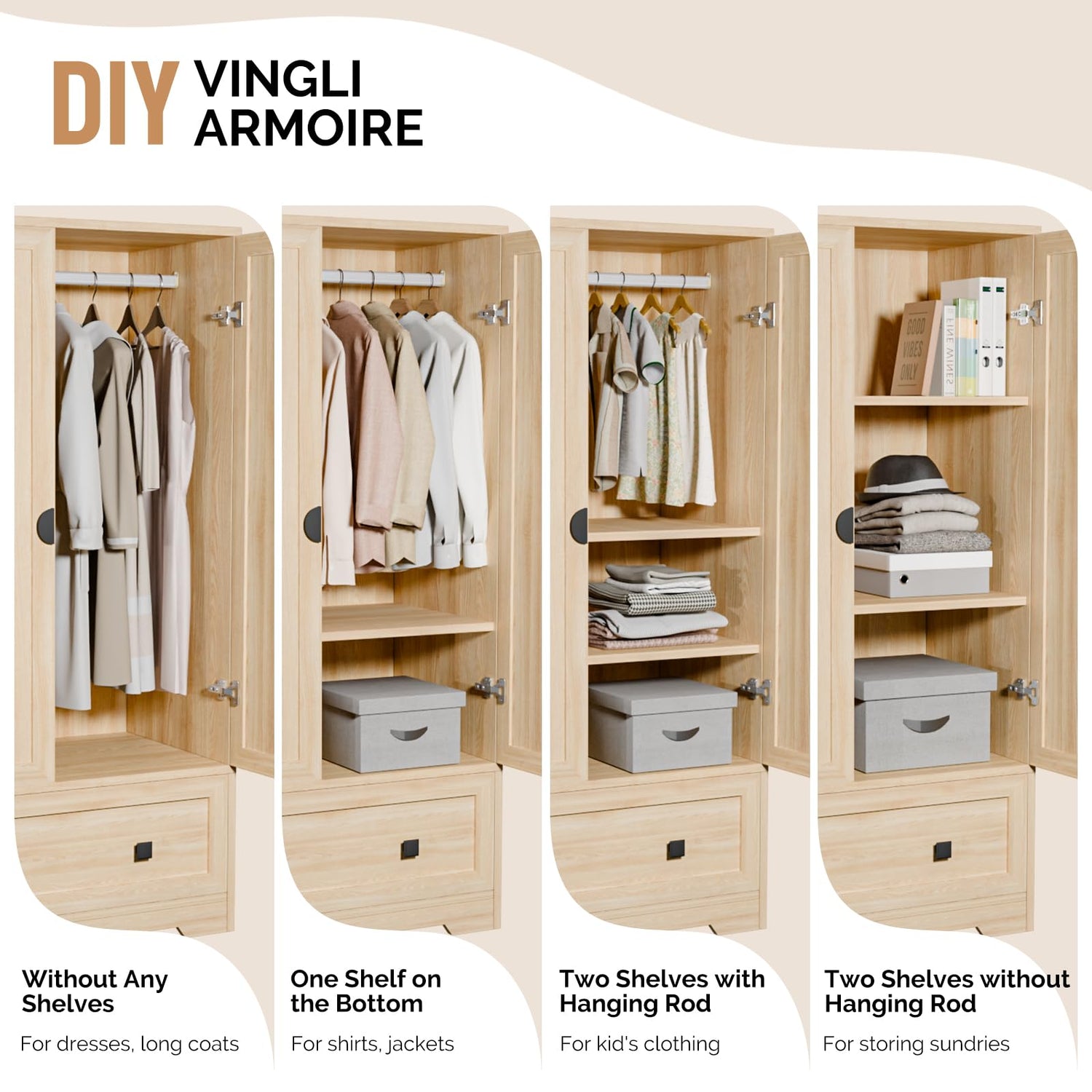 VINGLI Wardrobe Closet, Armoires and Wardrobes with Doors,Hanging Rod, Shelves and Drawer, Freestanding Closet Wardrobe Cabinet, Oak Armoire Wardrobe for Bedroom, Dorm, 38" W x 21" D x 65" H
