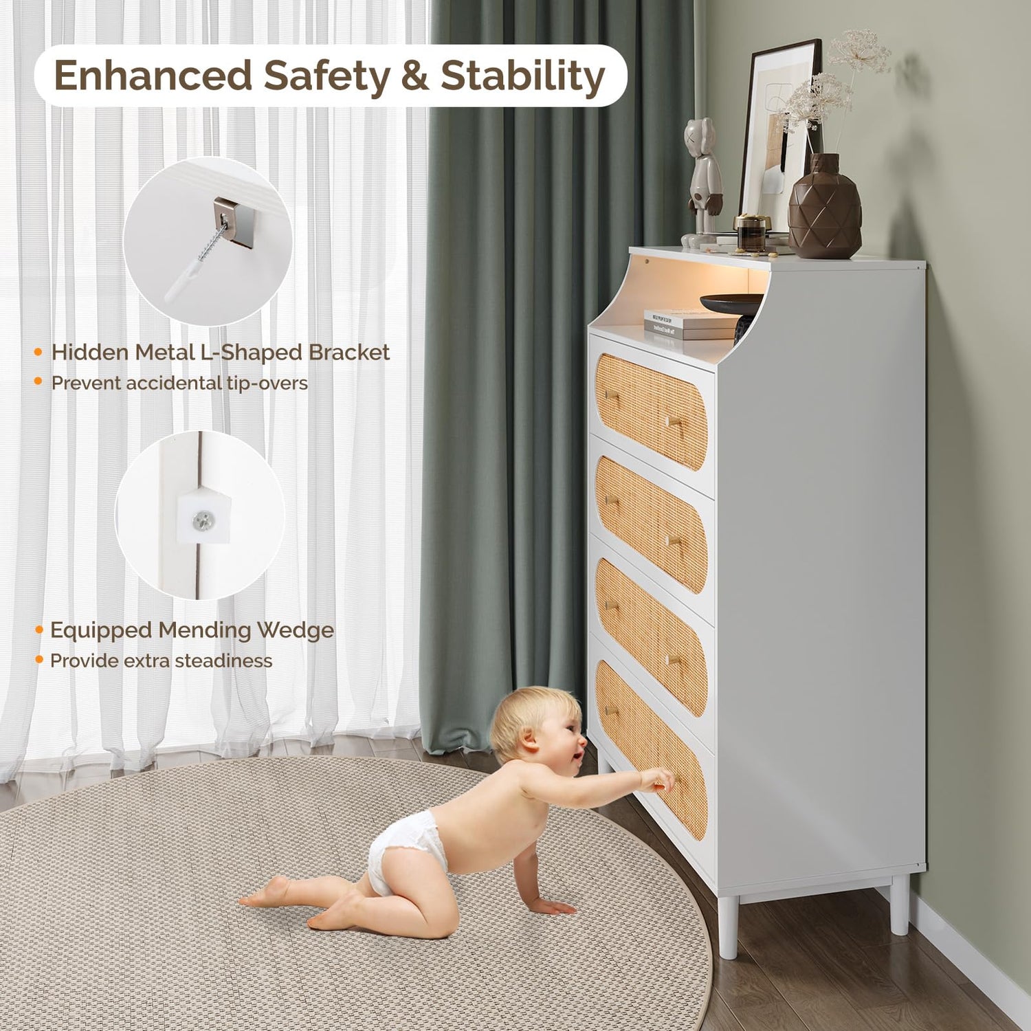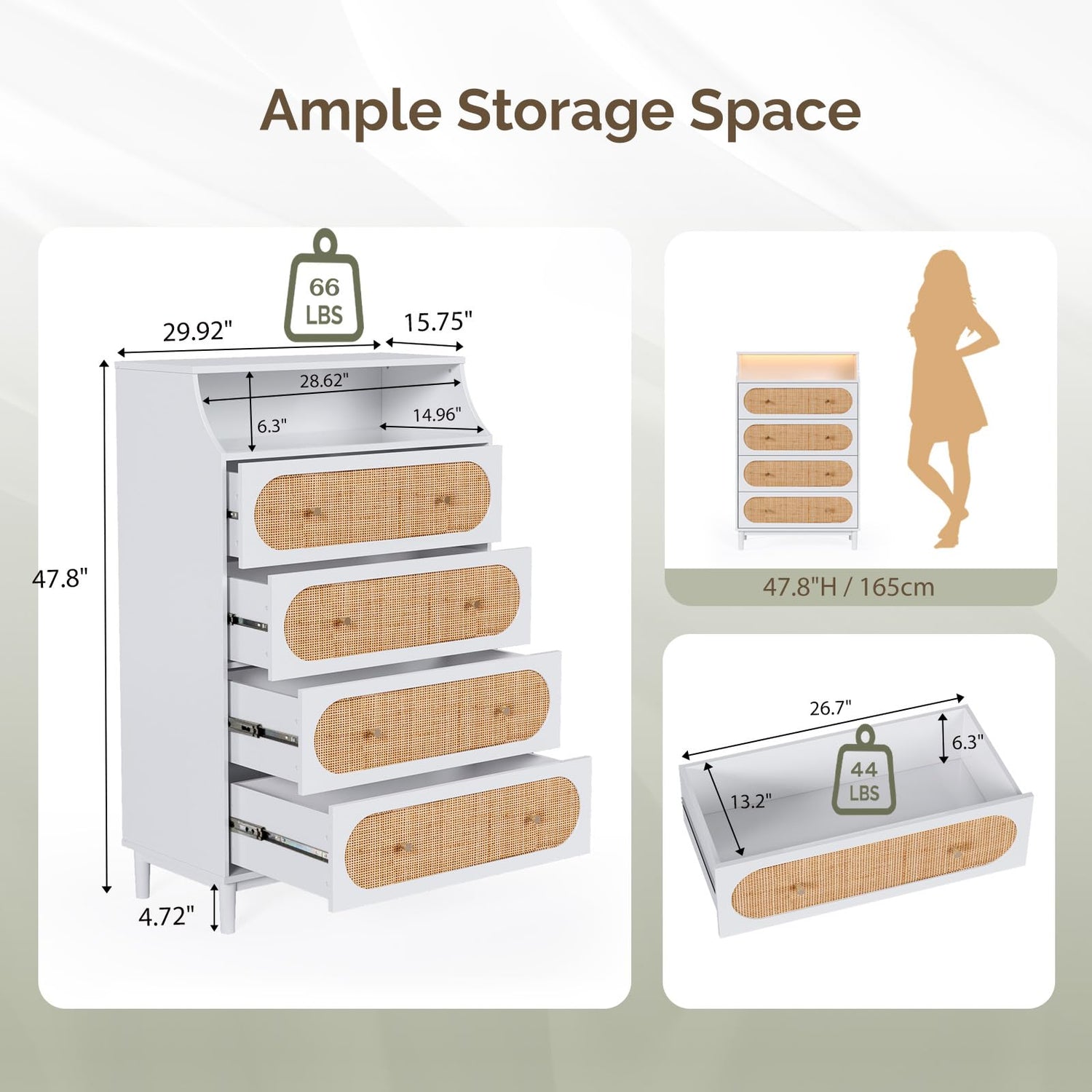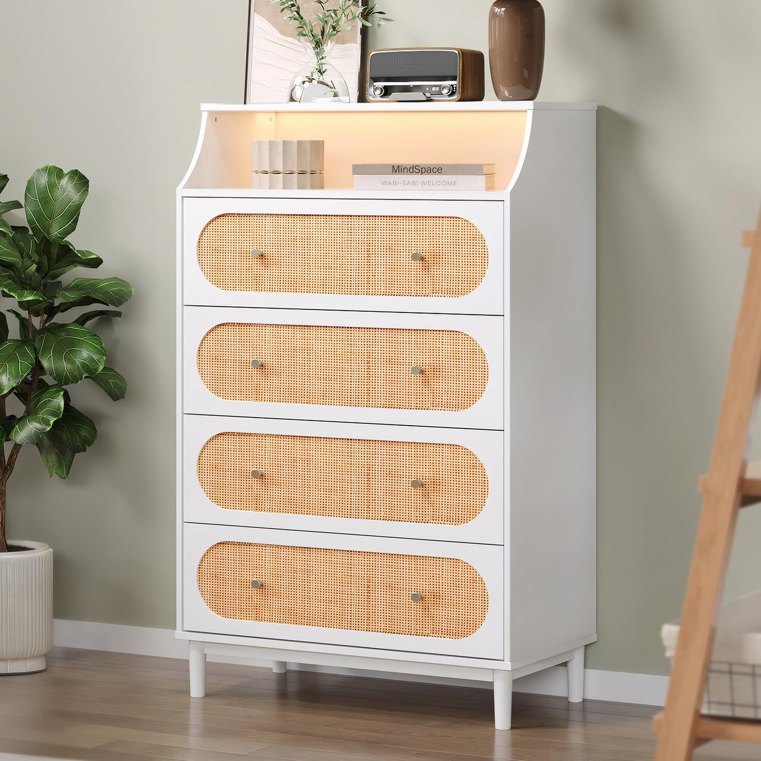 VINGLI White Rattan Dresser with LED Lights, Tall Dresser, Rattan Chest of Drawers for Bedroom, Vertical 4 Drawer Dressers for Bedroom, Boho
