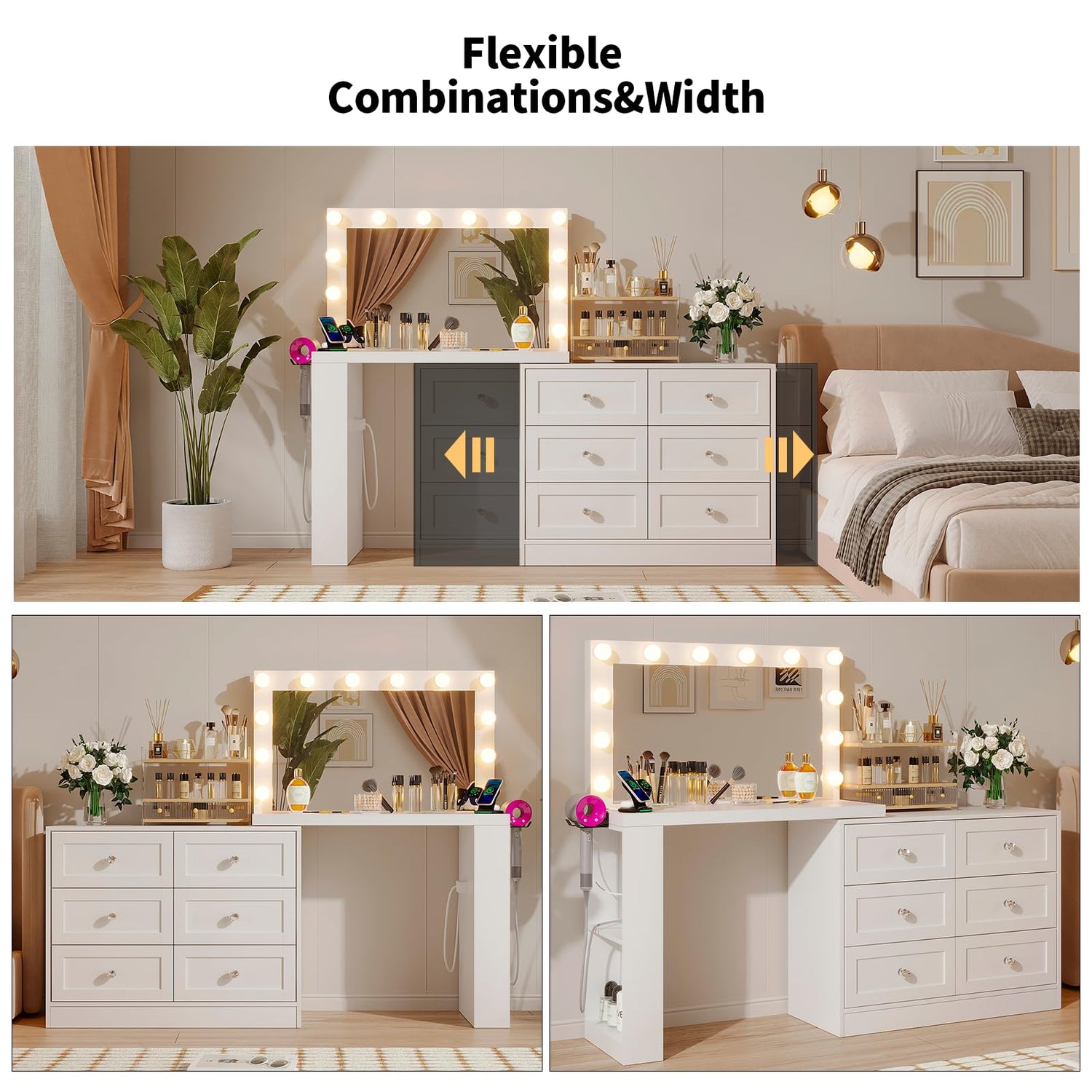 VOWNER Vanity Desk and Dresser Combo, Extendable Makeup Vainty with with Lighted Mirror & Power Outlet, Wood Corner Vanity with 6 Drawer Dresser, Makeup Table for Women, Bedroom Dressing Table(White)