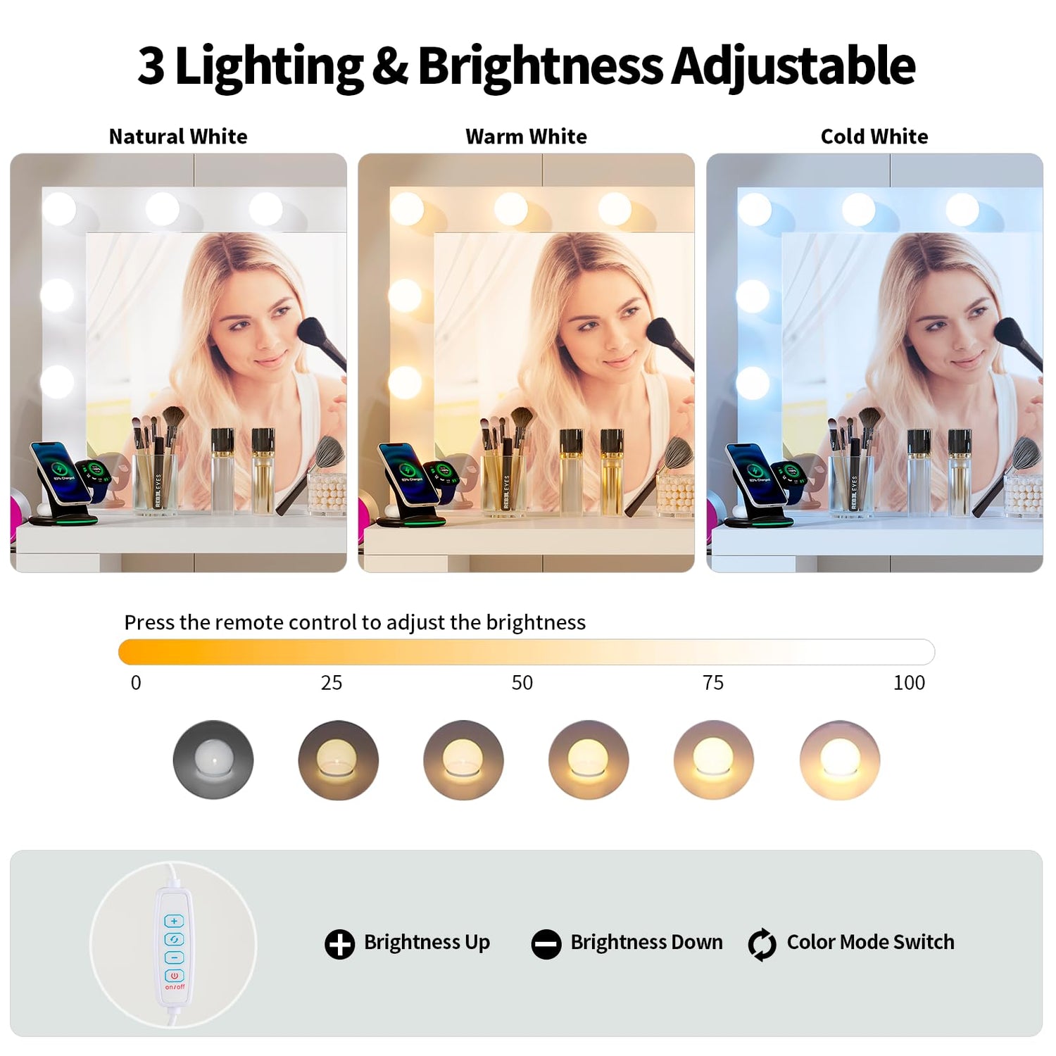 • 3 Color Adjustable: Equipped with a large lighted mirror with 3 color selections (warm, natural, cold white), this vanity desk with lights creates a comfortable makeup environment to meet your different makeup needs well.
