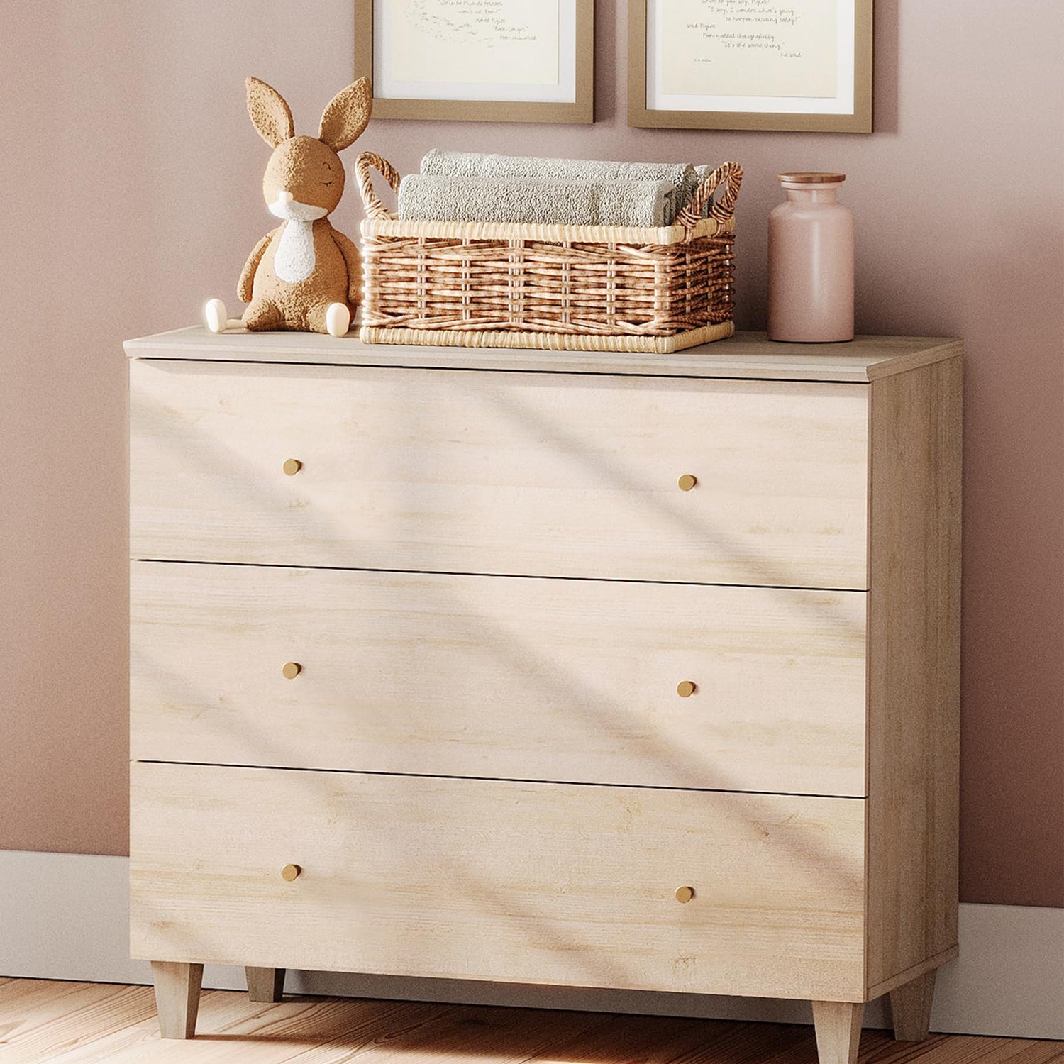 WAMPAT 3-Drawer Kids Dresser for Bedroom, Modern Small Chest of Drawers with Gold Knobs, 35 Inch Wide Light Oak Wood Children Dresser for Baby Room, Nursery, Living Room