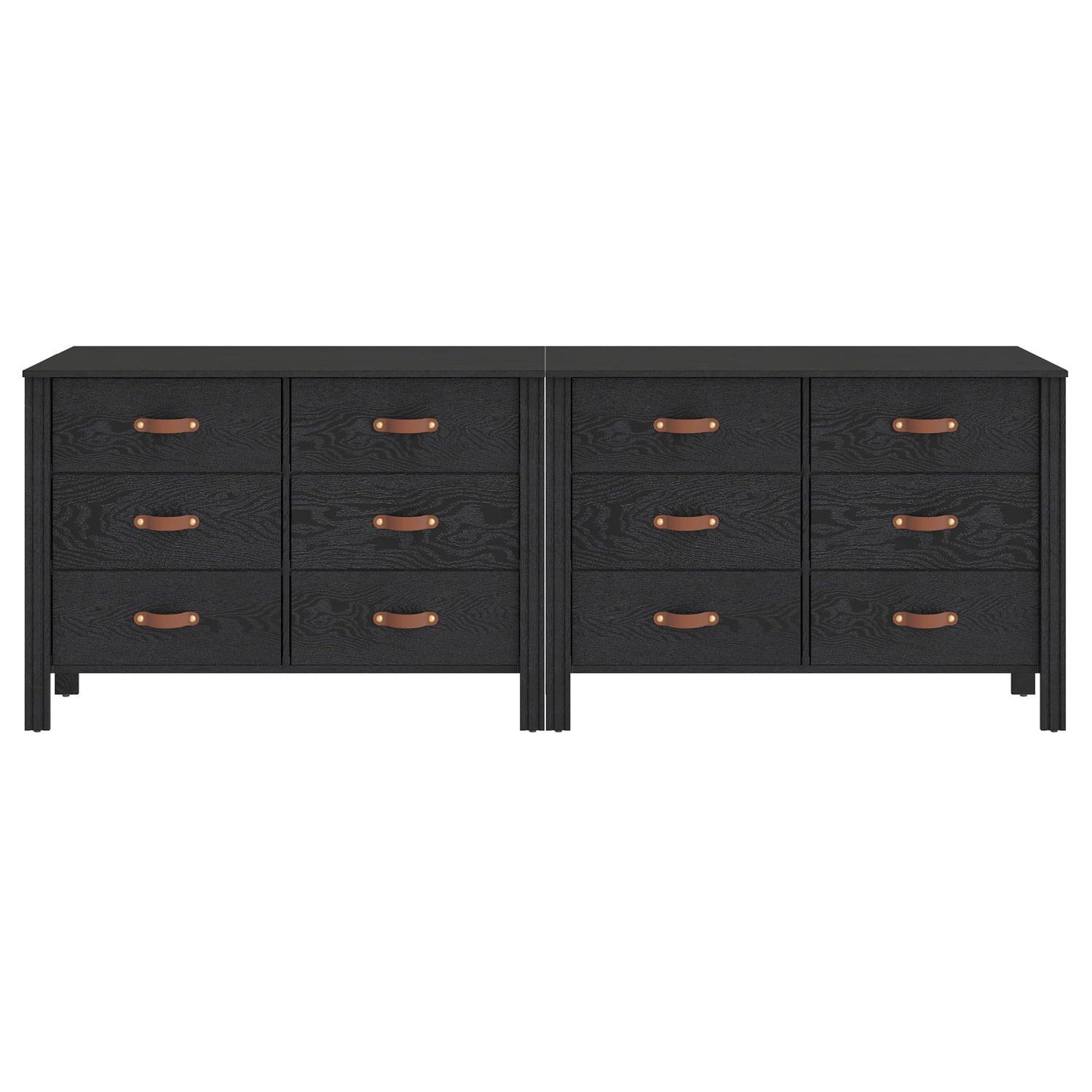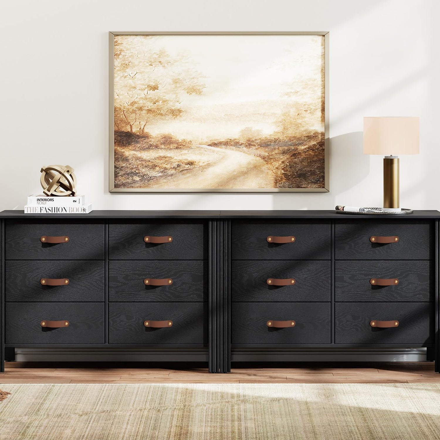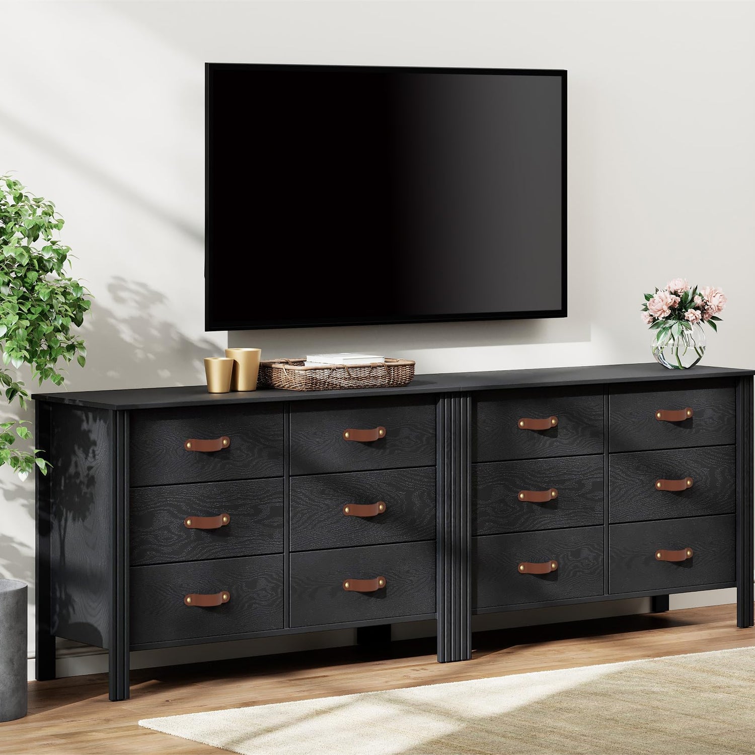 WAMPAT Black Dresser for Bedroom, Long Wide Dresser with 12 Drawers, Kids Dressers & Chests of Drawers, Set of 2 Classic Wooden Storage Cabinet Organizer for Closet, Living Room, Hallway