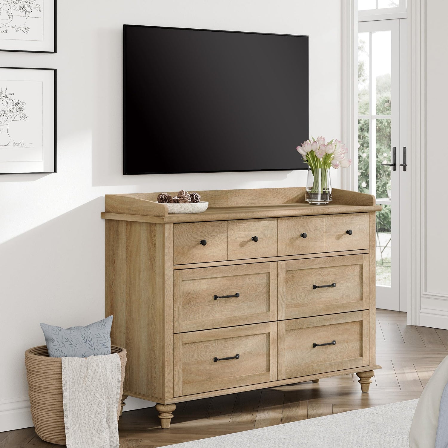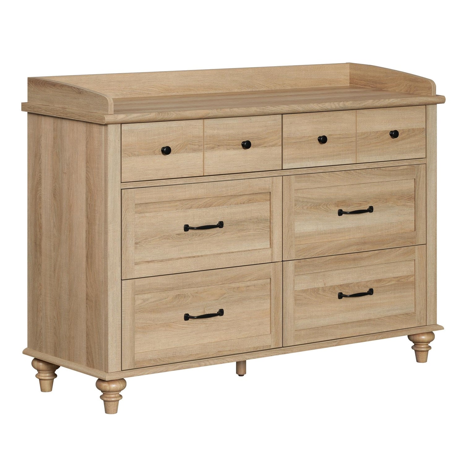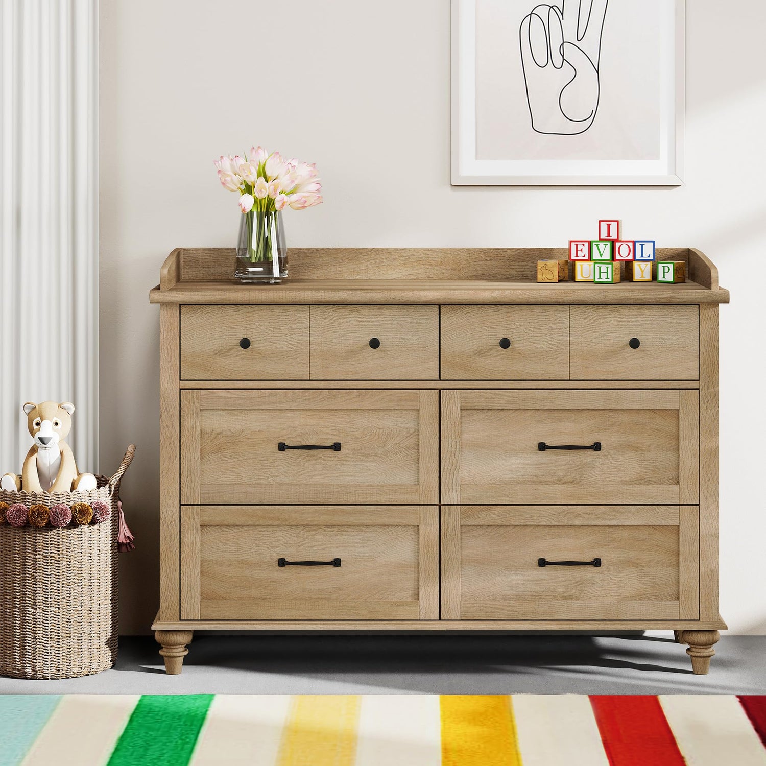- 【Ample 6 Storage Space】Featuring 6 deep drawers, the oak dresser is great to organize your clothes, blankets and other personal belongings. The large tabletop is perfect for displaying lamps, books, etc. And the tabletop is designed with anti-drop fence to prevent items from dropping off. The storage cabinet maximizes the vertical storage space while keeping your daily essentials and display decorations in order.