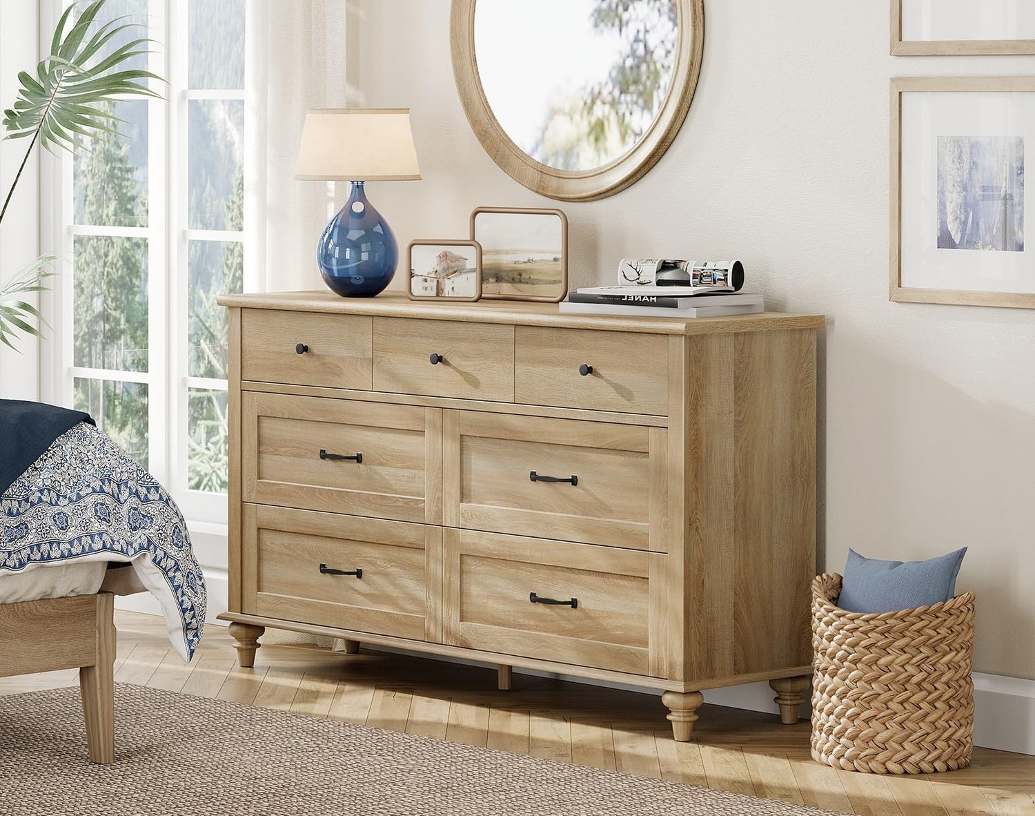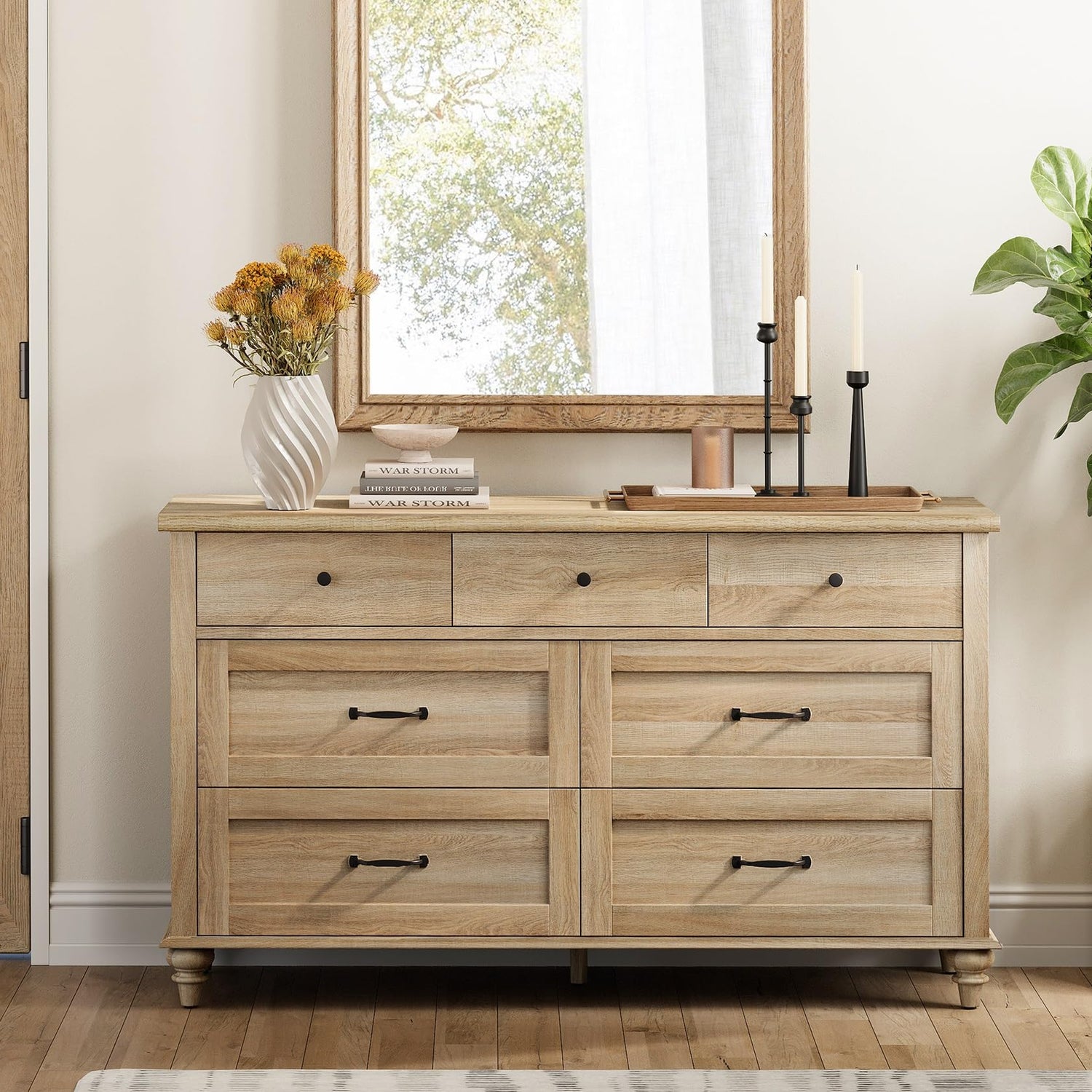 - 【Multi-purpose Dresser】The oak dresser with distressed surface and natural texture is a perfect combination of retro and mid century style, adding character and charm to your home. It can be used as a bedroom dresser, kids dresser, nursery dresser, entryway table or TV stand for 60" TV.