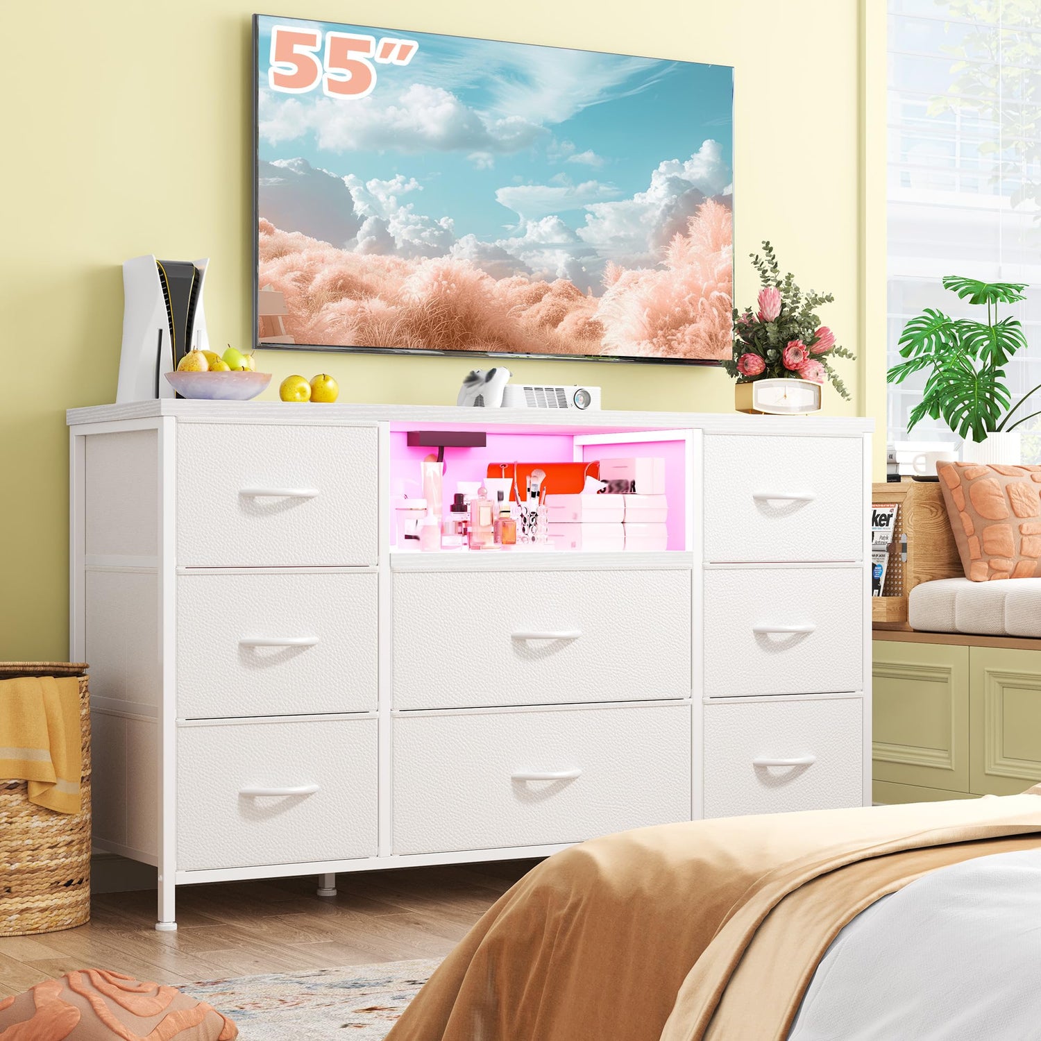 White Dresser TV Stand for 55'' with LED Lights & Charging Station, Dresser for Bedroom with 8 Drawer, Chest of Drawers with Open Shelves, 6 Adjustable Feet, Hallway, Entryway