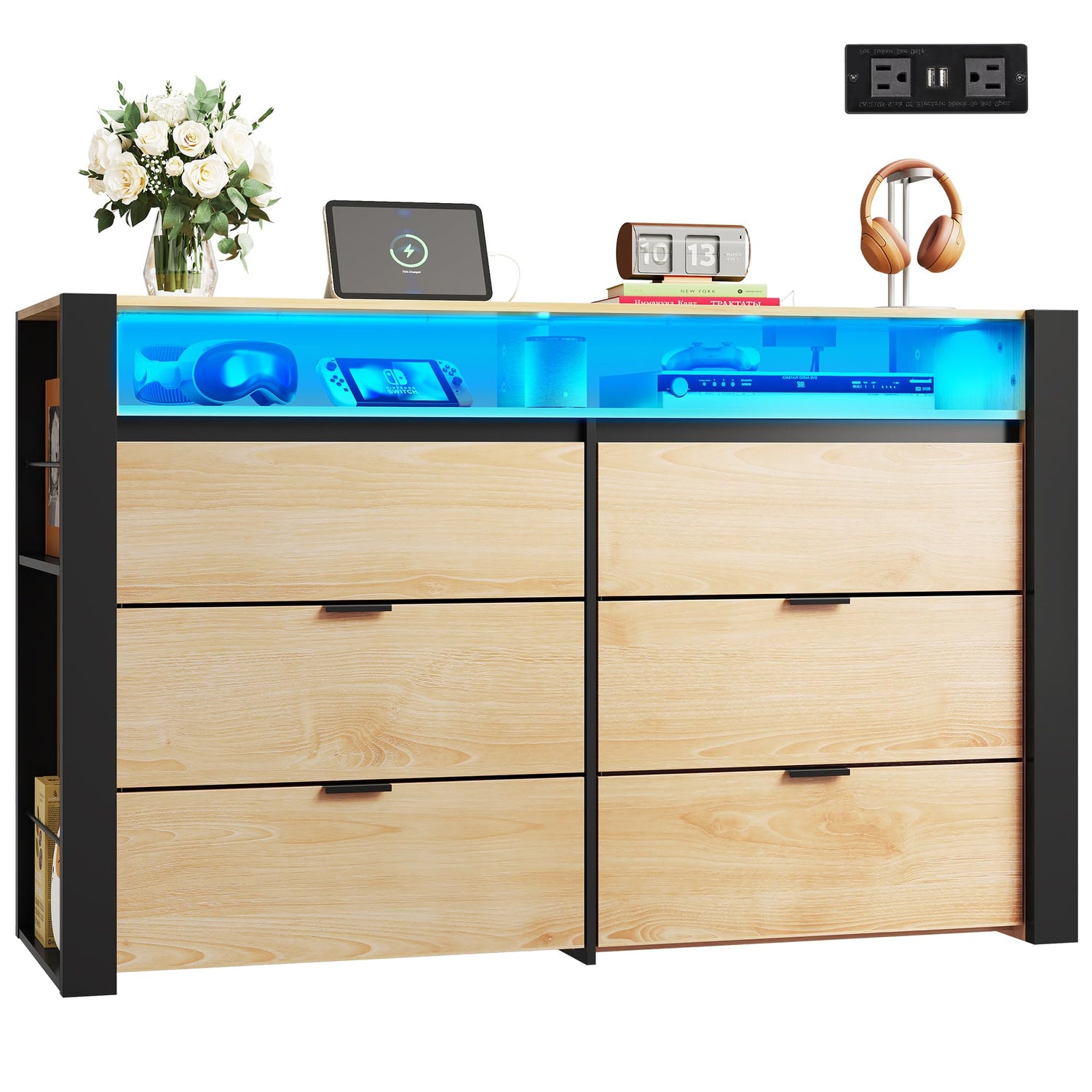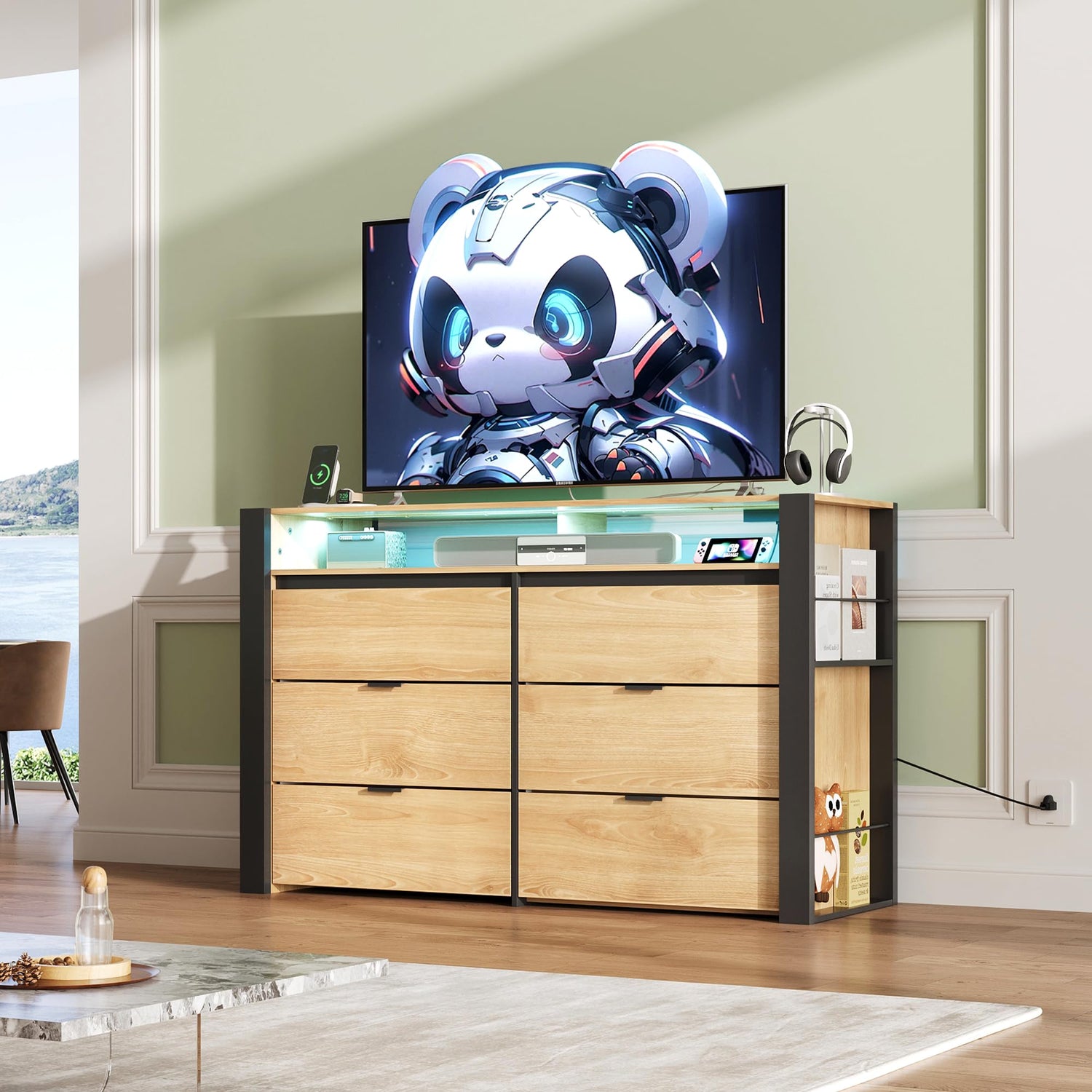 WLIVE 6 Drawer Dresser with Led Light, 50.79'' Wood Dresser for Bedroom with Power Outlets for 55'' TV, Modern Chest of Drawers for Closet, Hanging Rack, Double Wide Drawer for Living Room, Light Oak