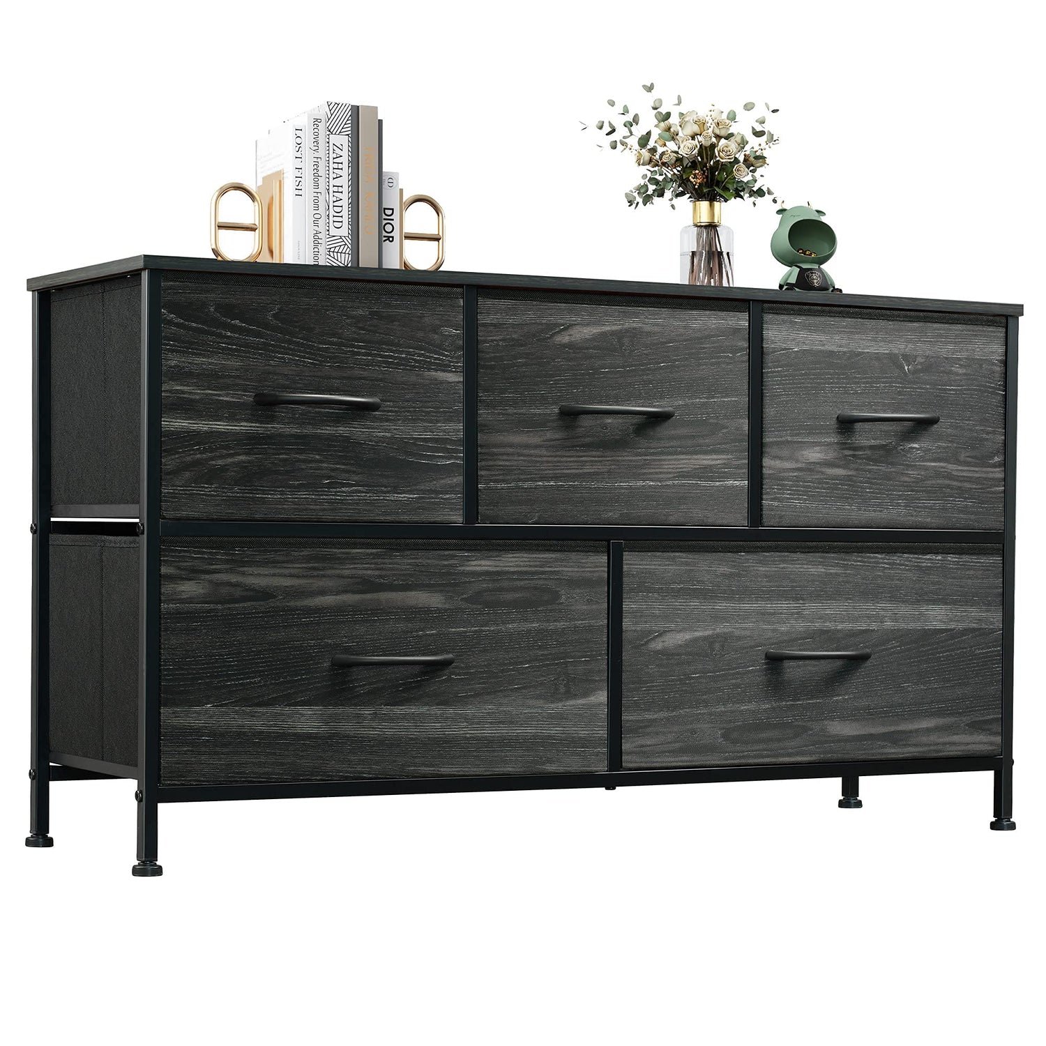 WLIVE Dresser for Bedroom with 5 Drawers, Wide Chest of Drawers, Fabric Dresser, Storage Organizer Unit with Fabric Bins for Closet, Living Room, Hallway, Charcoal Black Wood Grain Print