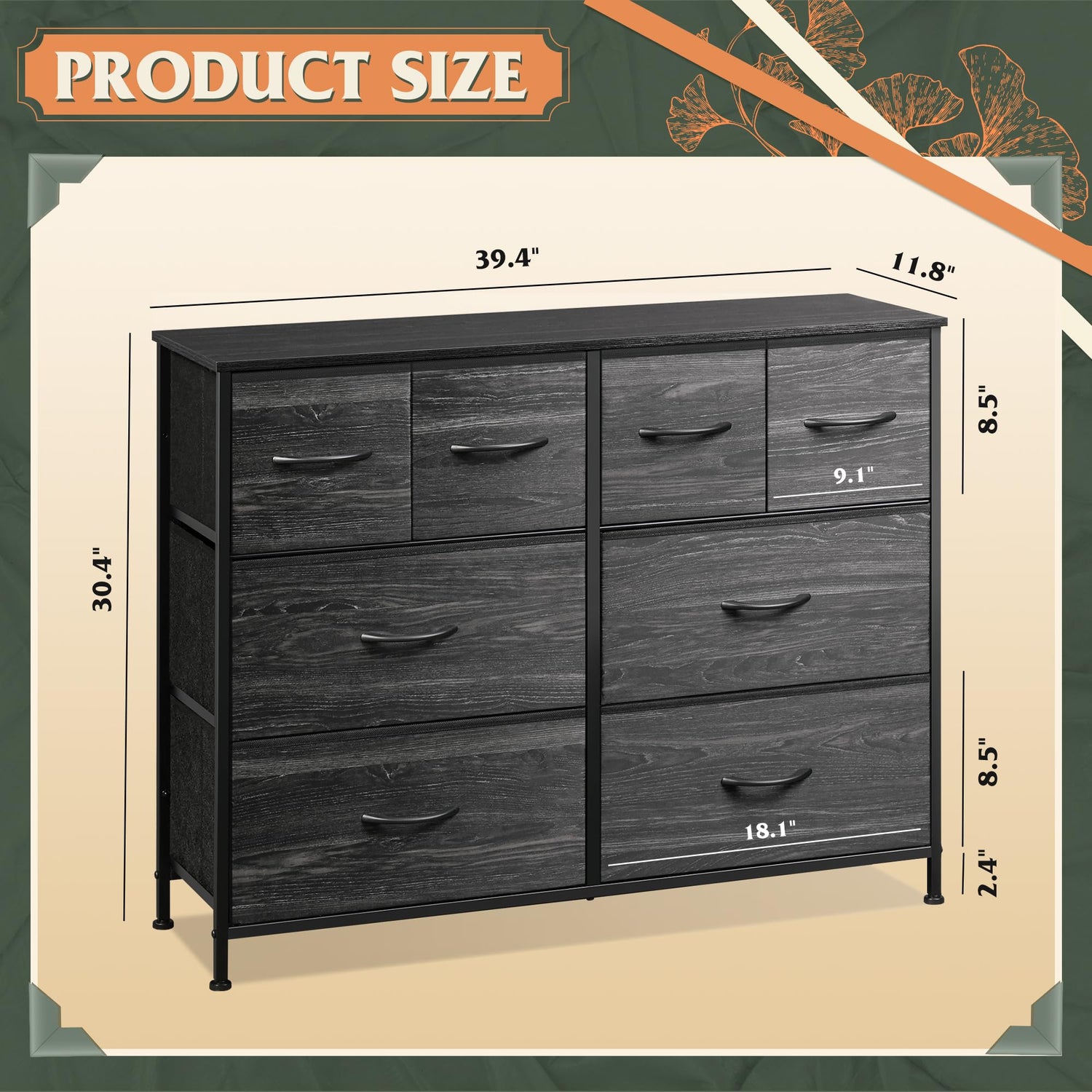 WLIVE Dresser for Bedroom with 8 Drawers, Wide Fabric Dresser for Storage and Organization, Bedroom Dresser, Chest of Drawers for Living Room, Closet, Hallway, Charcoal Black Wood Grain Print