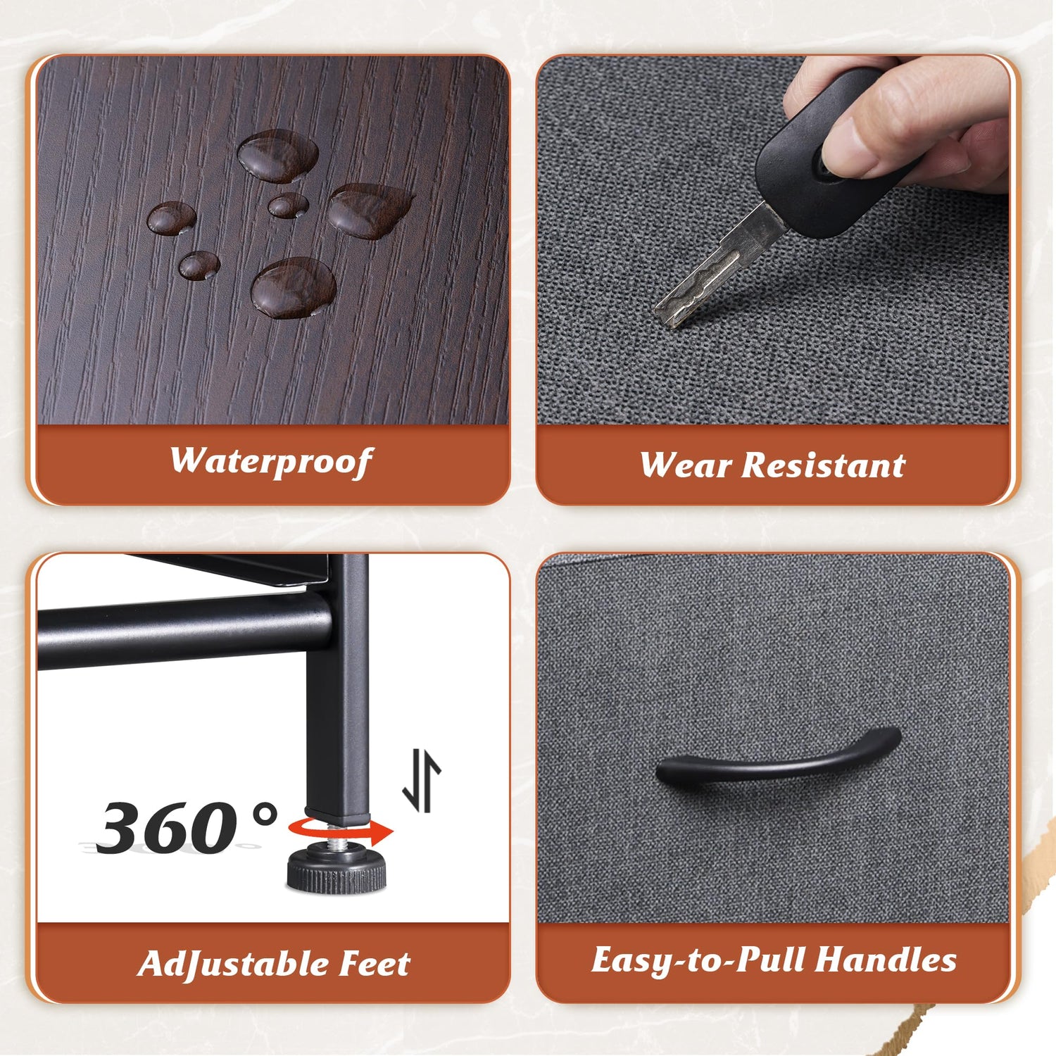 * STURDY STRUCTURE: Strong steel frame and water-resistant wood top offers stable support and ensue years of use; High-quality linen fabric drawers is easy to clean