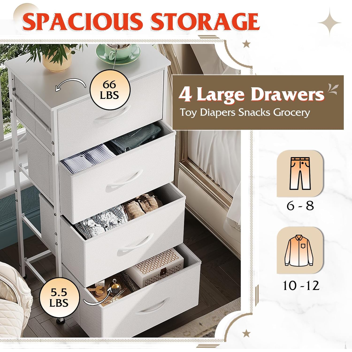 WLIVE Dresser with 4 Drawers, Storage Tower, Organizer Unit, Fabric Dresser for Bedroom, Hallway, Entryway, Closets, Sturdy Steel Frame, Wood Top, Easy Pull Handle, White