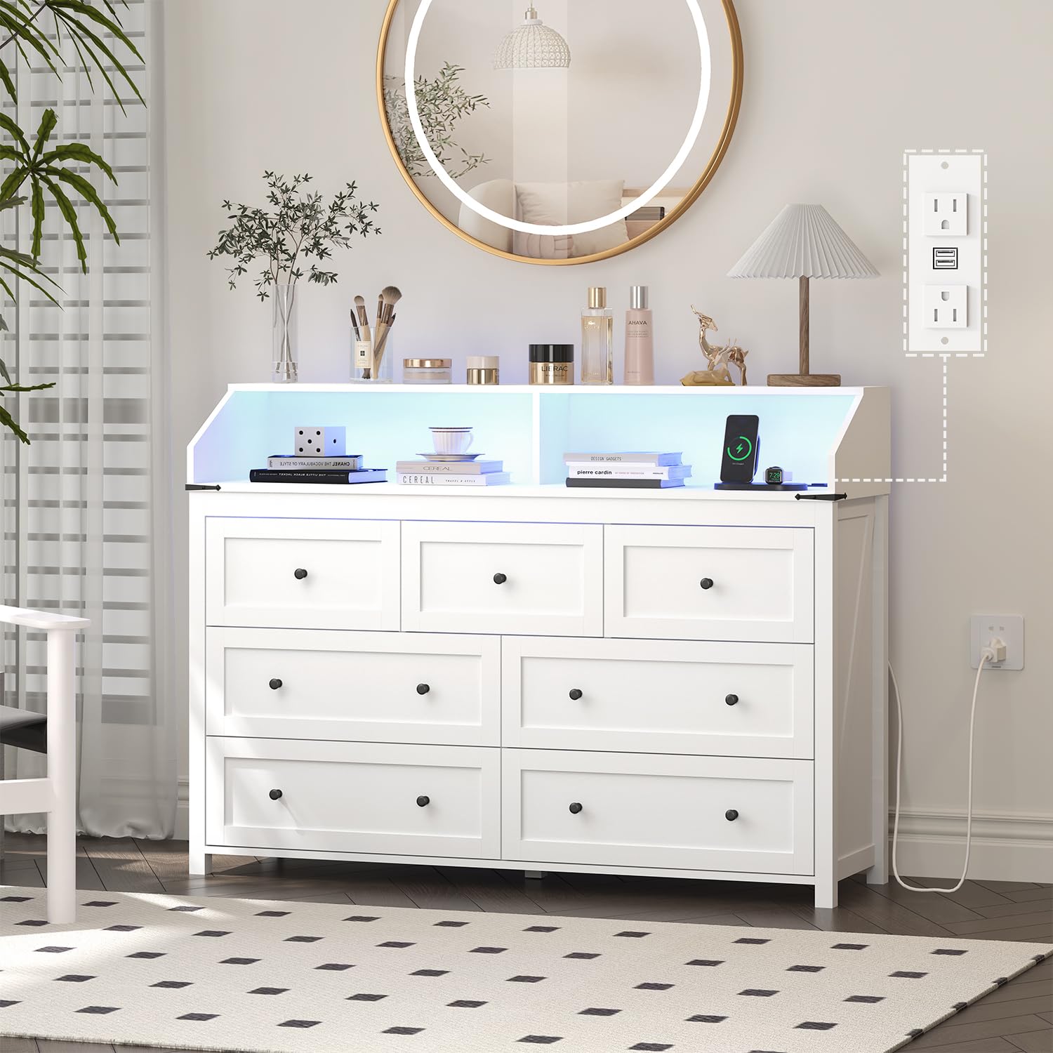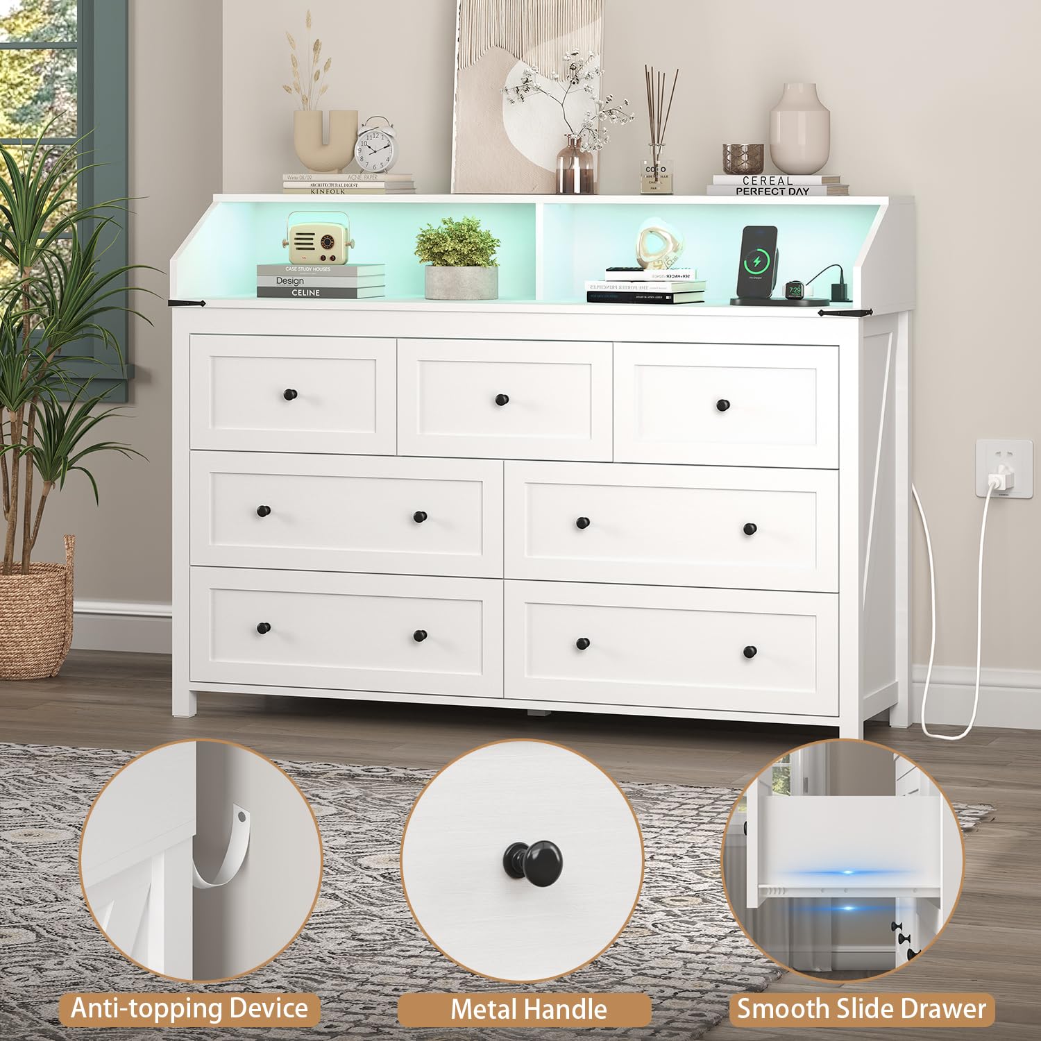 Wodeer Dresser for Bedroom with Power Strip & LED Light,7-Drawer Dresser & Chest of Drawers with Deep Drawers, Wood Double Dresser Storage Cabinet for Bedroom,Living Room, Hallway,White