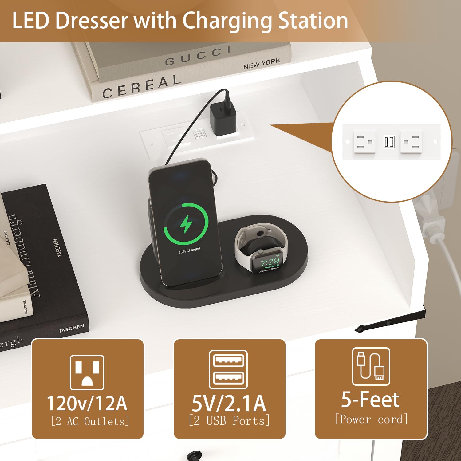 - Dresser with LED Light:This Led dresser for bedroom is equipped with multi-color RGB LED light, colors and brightness can be freely adjusted through the button and App, or customize style modes (Flashing,Jump,Fade,etc) in different speeds, add a unique vibe to your home.And there are many other modes waiting for you to explore: music mode, mic mode and timer setting function.
