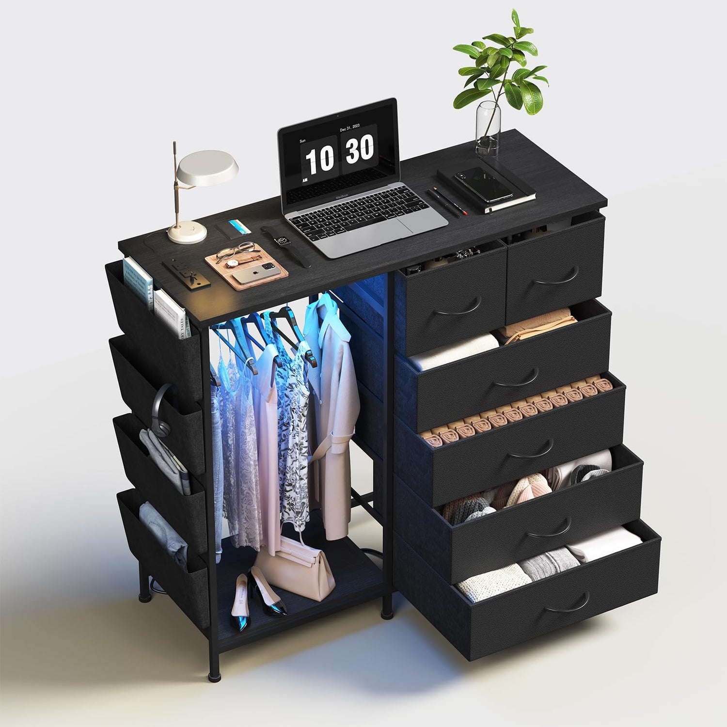 WODRAWER 6 Drawer Dresser for Bedroom with Clothes Rack, Clothes Dresser with Side Pockets and Hooks, Charging Station & LED Lights, Wooden Top, Fabric Storage (Black)