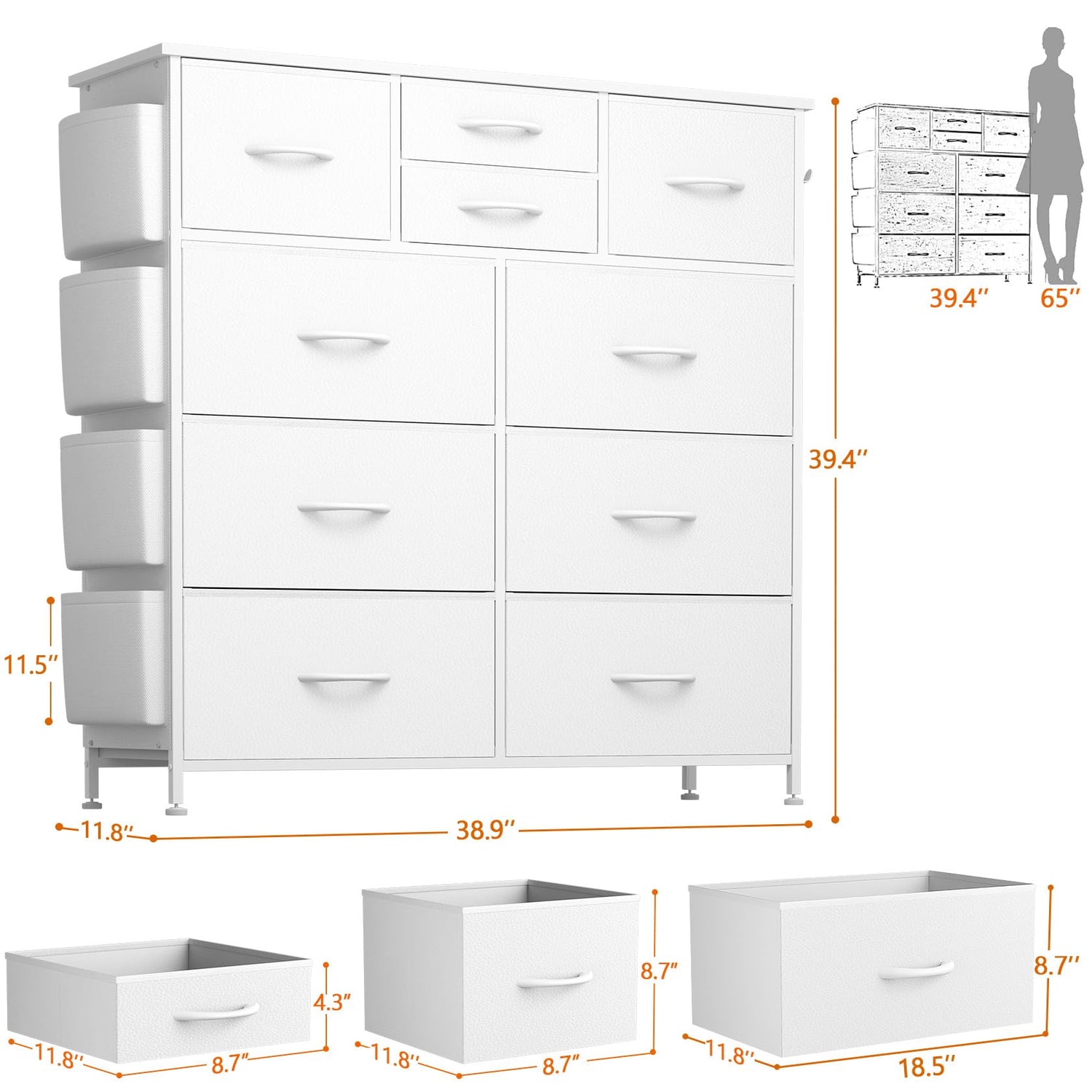 YaFiti 10 Drawer Dresser, Chest of Drawers for Bedroom, PU Dresser with Side Pockets, Hooks, Wooden Top and Sturdy Metal Frame for Living Room, Closet, Hallway (White)
