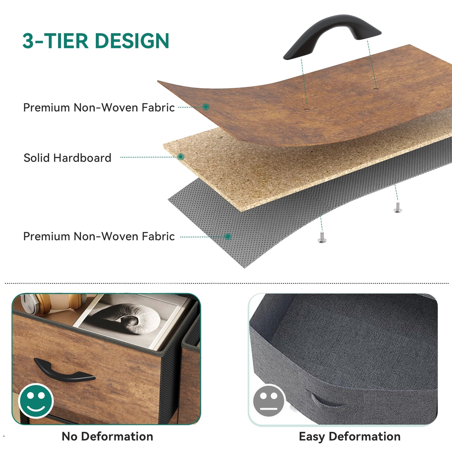 - VERSATILE COLOR SCHEME- Highlights a sleek, modern design combining premium charcoal fabric drawers, a sturdy black metal frame, and a waterproof wooden tabletop; Perfect for living rooms, bedrooms, hallways, entryways, closets, etc.