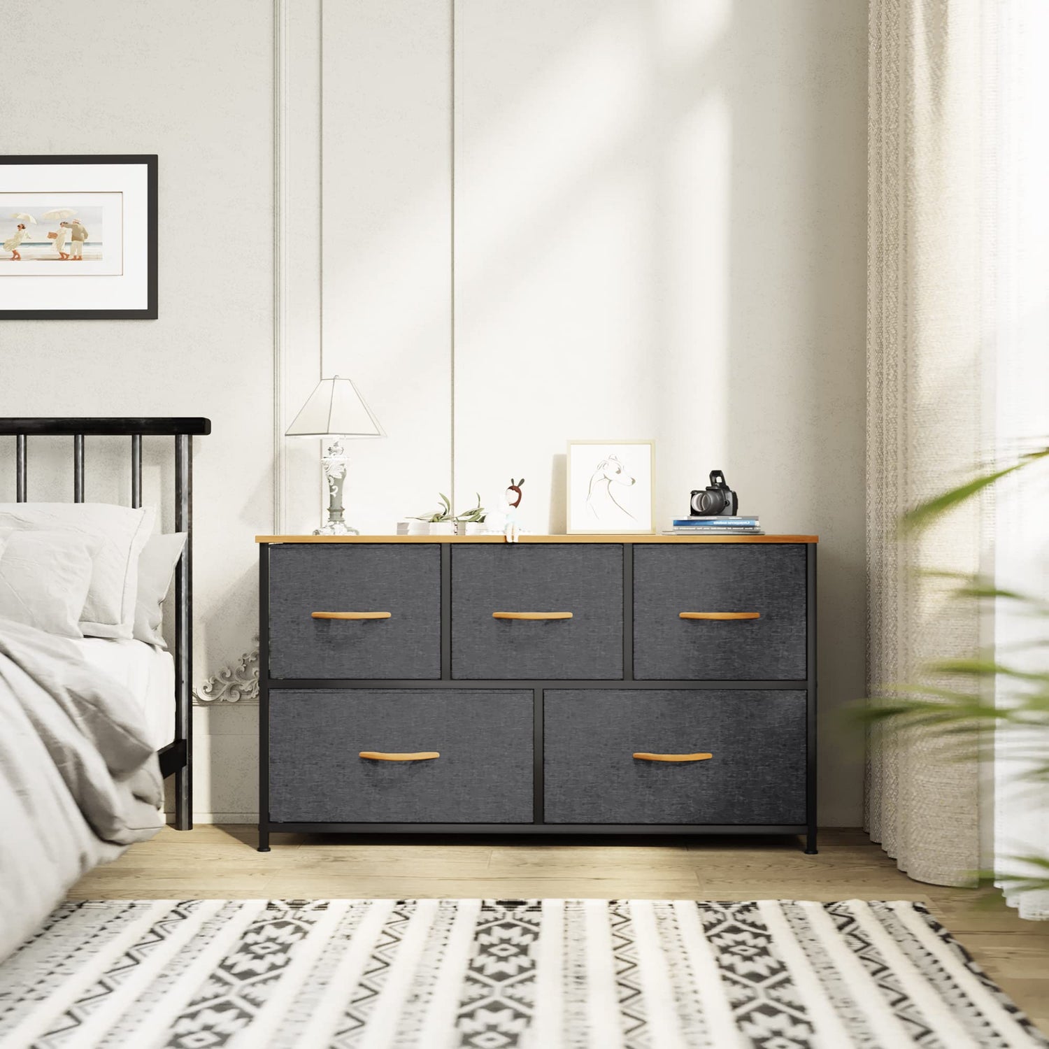 YITAHOME Dresser with 5 Drawers - Fabric Storage Tower, Organizer Unit for Bedroom, Living Room, Closets - Sturdy Steel Frame, Wooden Top (5 Wider Drawers Cool Grey)