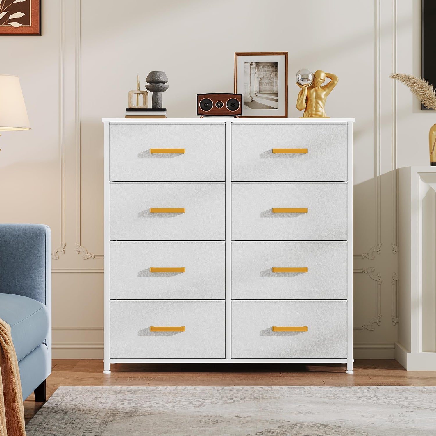 - The dresser for bedroom is made of reliable metal frame and durable MDF wooden top; 8 removable and foldable storage drawers; Easy pull plastic handles help conveniently open and close the drawers; 4 adjustable plastic feet help protect your floor from scratches.