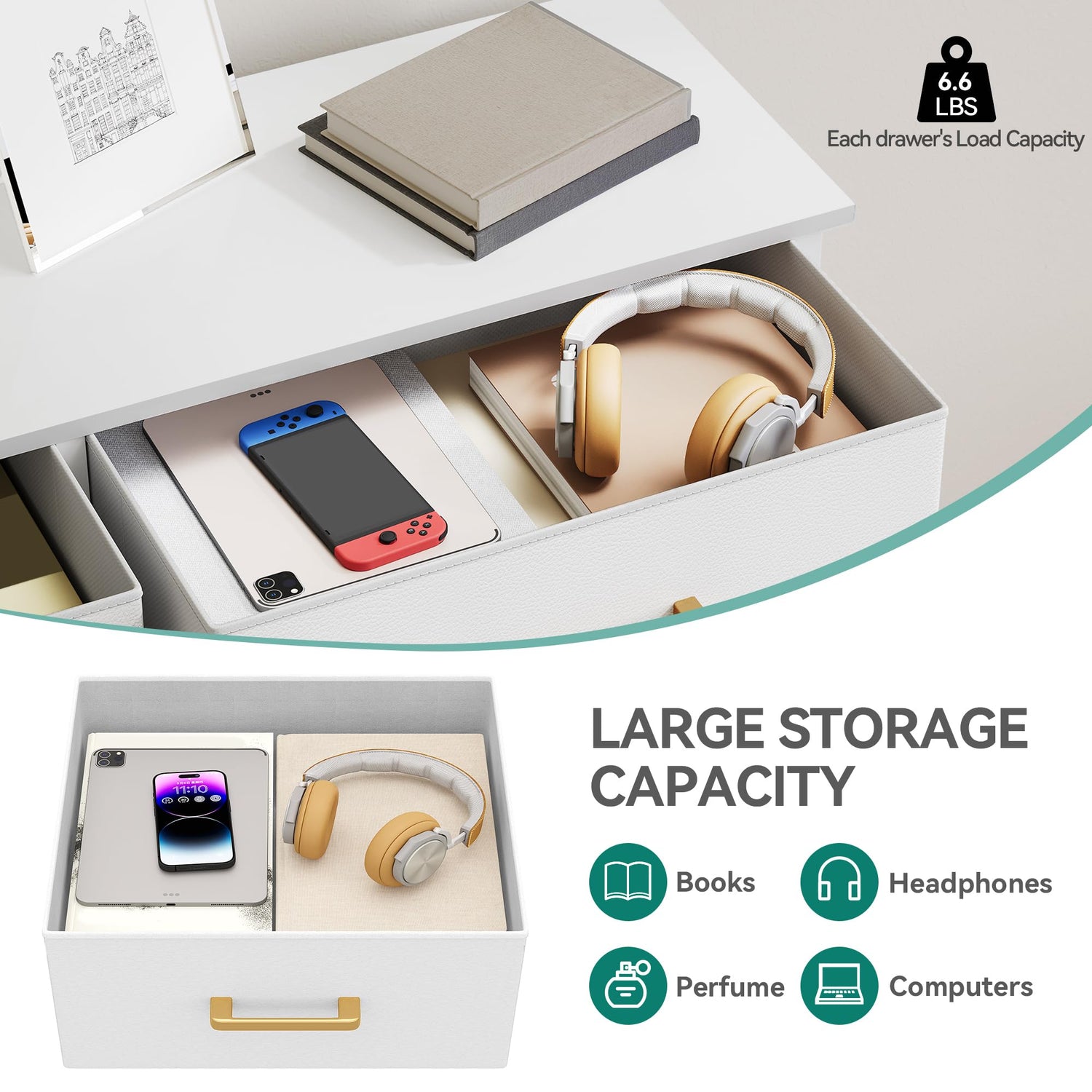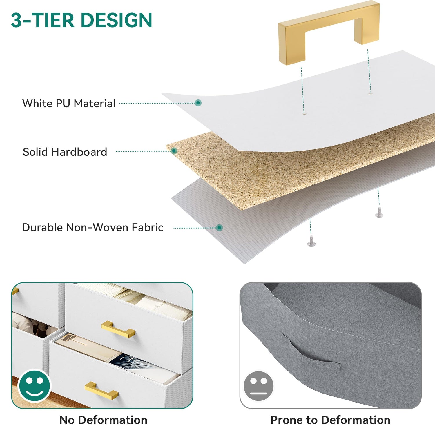 - The drawer organizer have White PU fabric drawers, sturdy white metal frame and wooden tabletop give the storage organizer a modern style. This dresser easily fits in various living spaces: living rooms, bedrooms, hallways, entryways, closets, etc.
