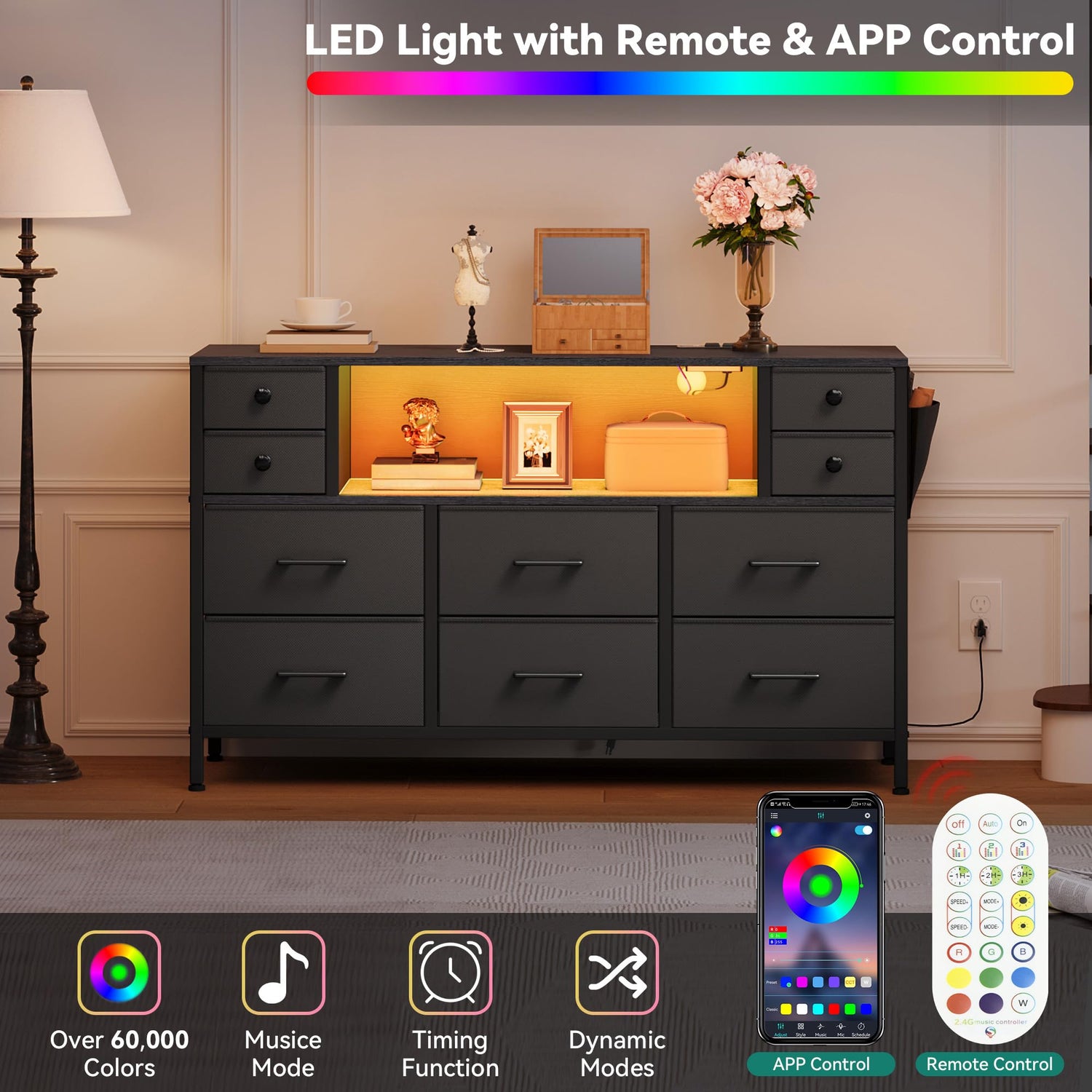 - Outstanding TV Stand Dresser: Our long dresser for room stands out with its built-in power outlet and LED light design that seamlessly blends style with function; Customize the lighting tone with 60,000 DIY color options via the included remote or App; Built-in power outlets (2AC+2USB+1TC) on long drawers to grant convenient charging