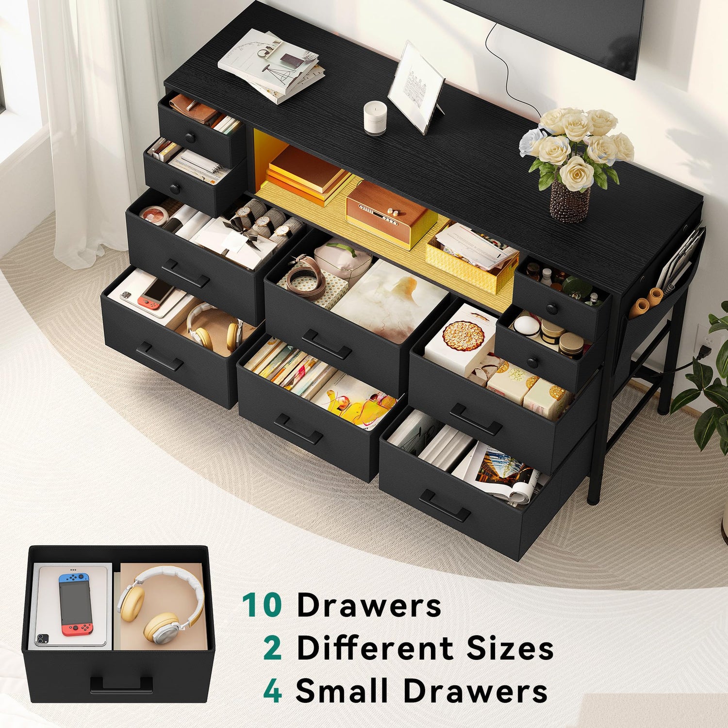 - Effective Storage: This 10-drawer dresser TV stand offers ample space to keep your essentials and items organized in your closet, room, living room, or home office; Its wooden storage tier and tabletop can accommodate TVs of up to 55 inches; Additional storage pockets on the side offer extra convenience