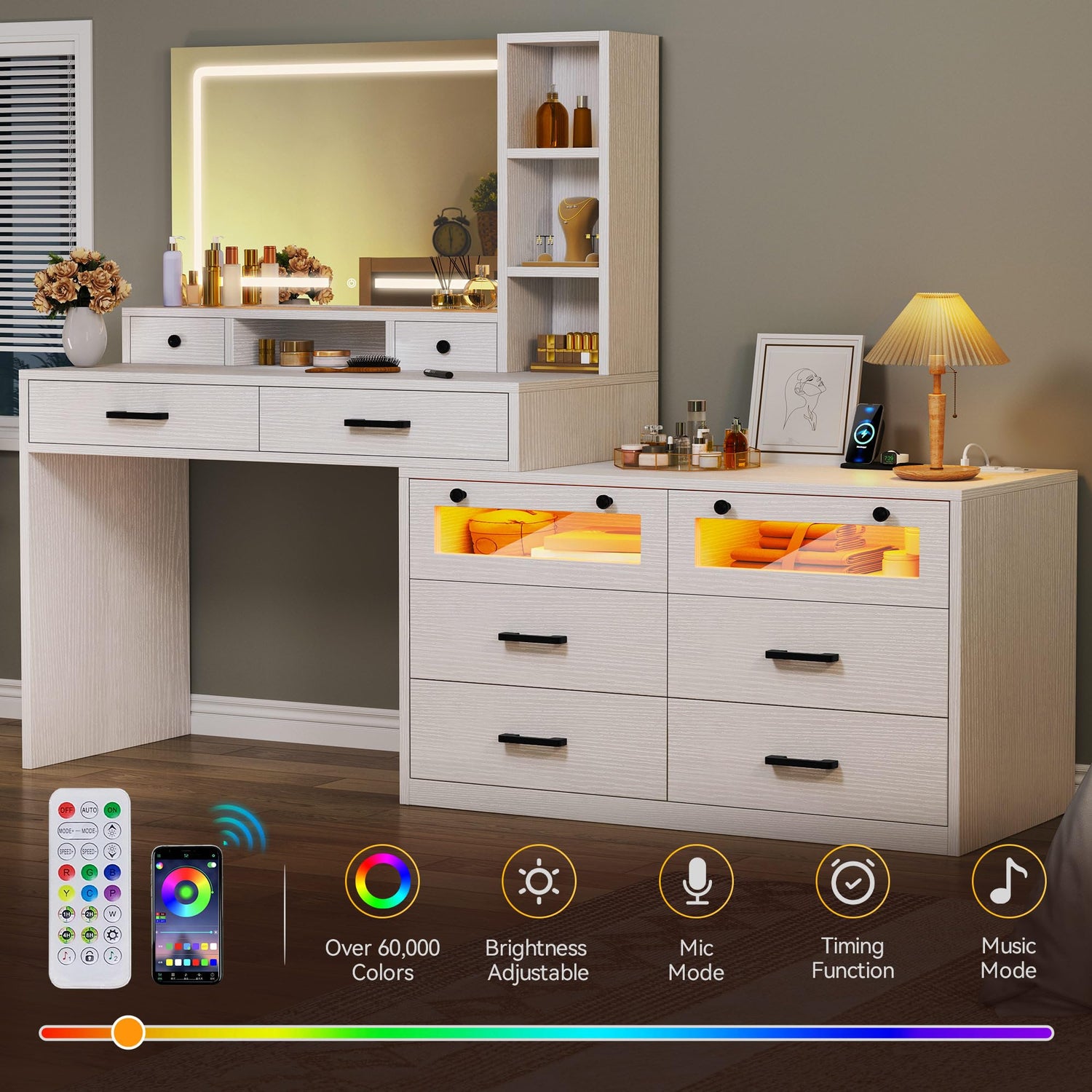 Details: YITAHOME Vanity Desk with Mirror and Lights, RGB Makeup Vanity Table Set with 10 Drawers and 4 Storage Shelves, 3 Lighting Modes Adjustable, Large Makeup Dressing Table with Charging Station, White