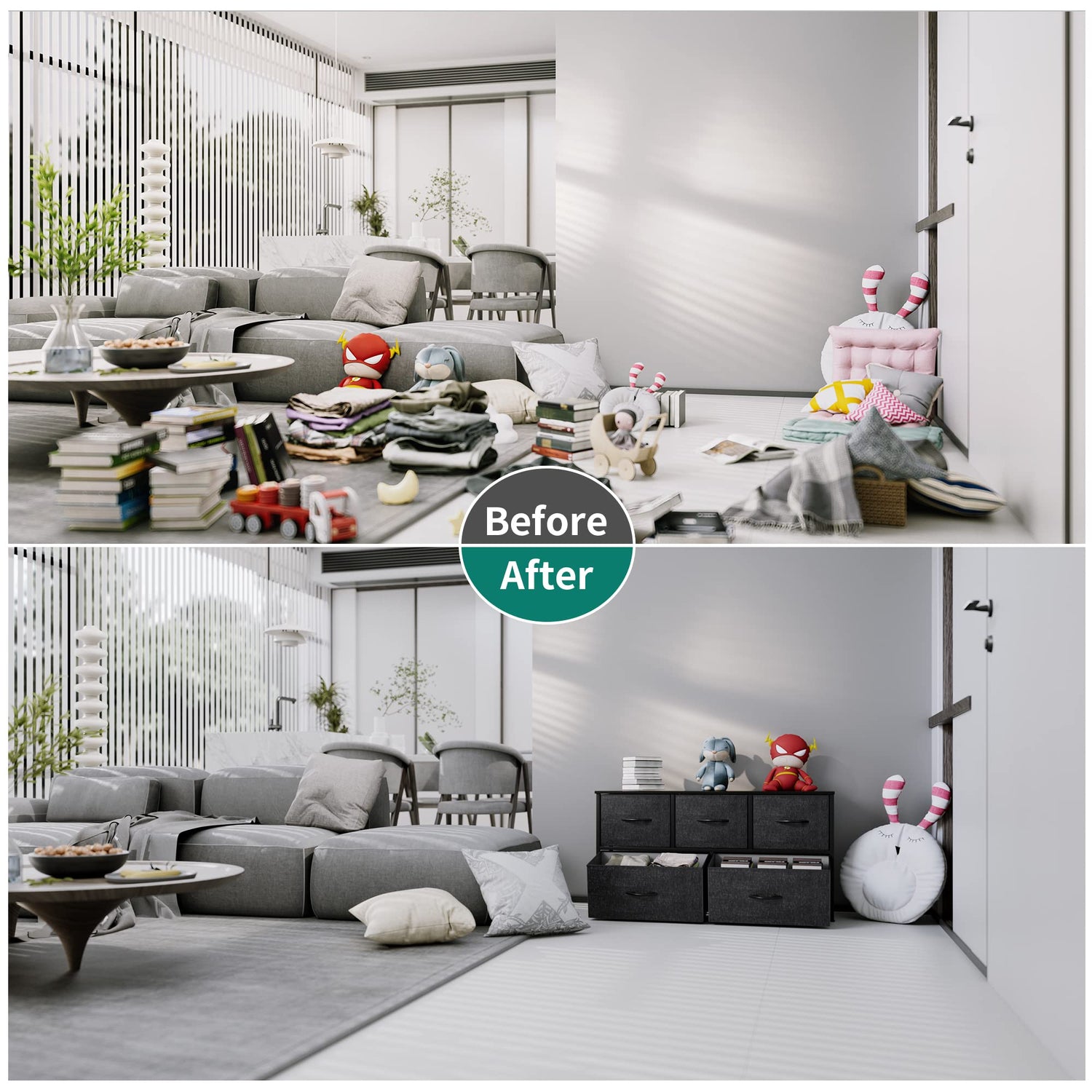 • UNIVERSALLY COMPLEMENTARY- Premium black grey fabric drawers, with sturdy black metal frame and wooden tabletop; Enjoy modern scent and stylish aesthetics that easily complements various living spaces: living rooms, bedrooms, hallways, entryways, closets etc.