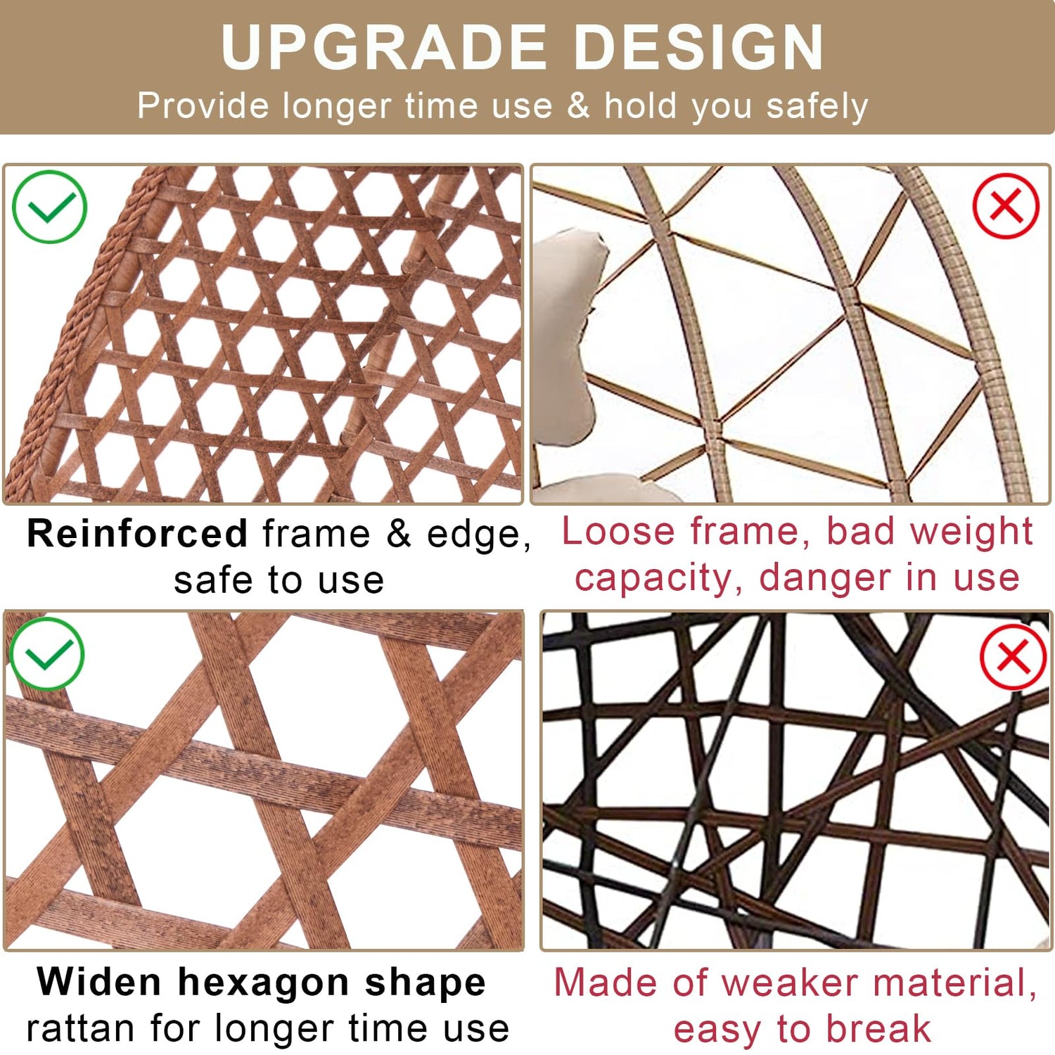 - 【Reinforced Frame】Unlike other cheaper egg chair outdoor with loose &fragile rattan basket frame, our upgraded reinforced frames is hand knitted with hexagon thickened and high density rattan, which will provide better weight capacity, weather resistant, corrosion resistant and easy to cleanup, prolong service life.