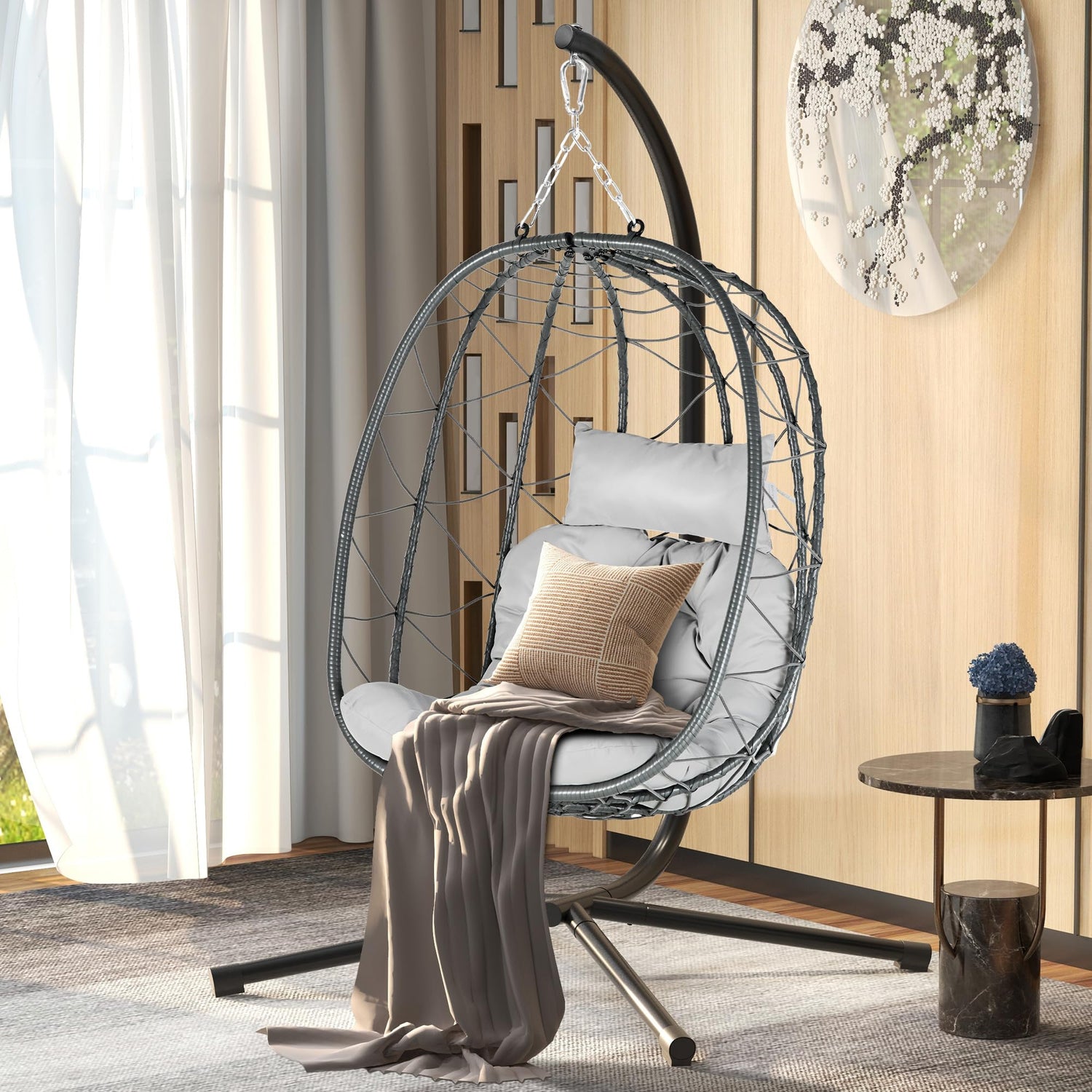 DWVO Egg Hanging Swing Chair with Stand Egg Chair Wicker Egg Chair with Cushions 330lbs for Patio, Bedroom, Garden and Balcony, Gray