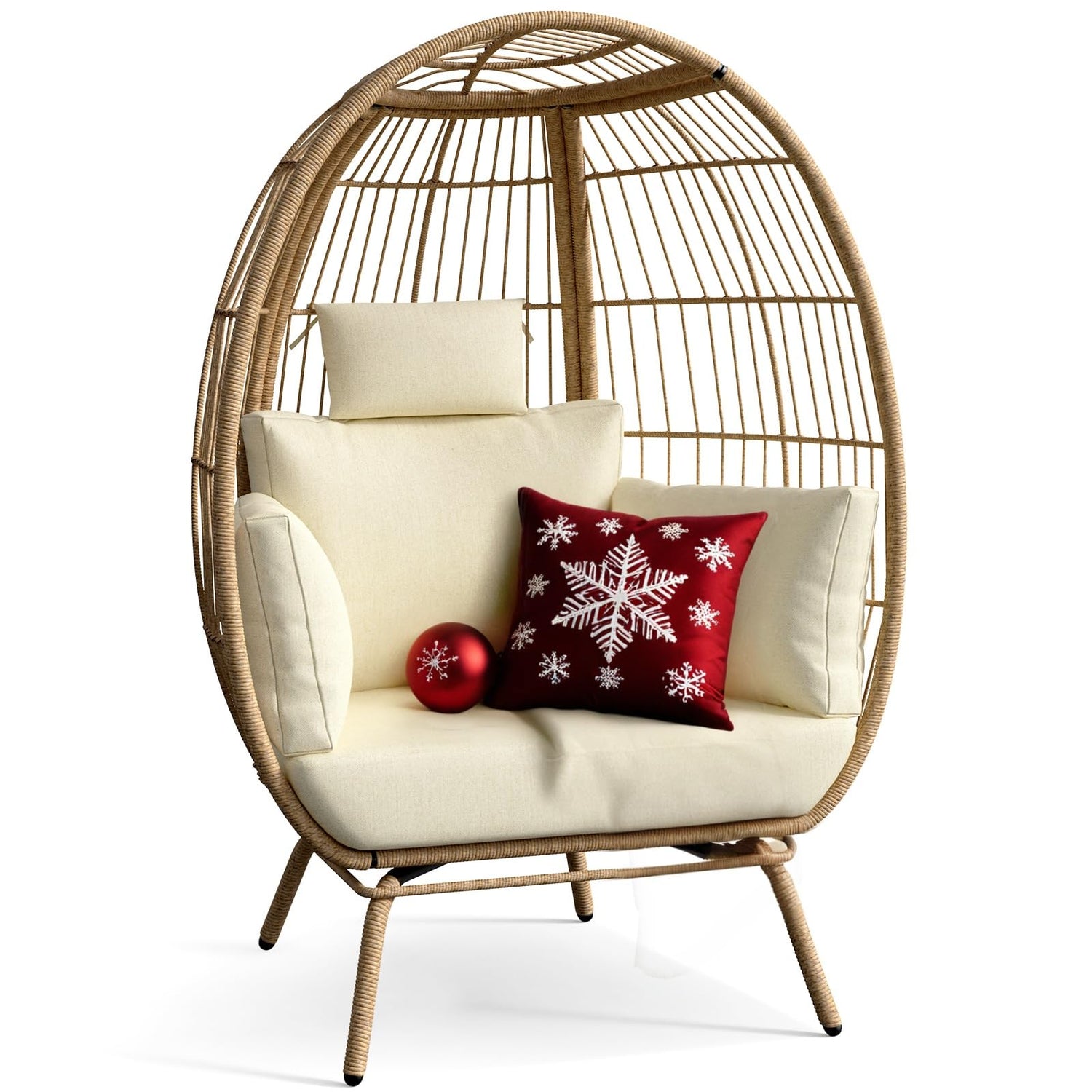 DWVO Oversized Egg Chair, Indoor Outdoor Egg Shape Wicker Chair for Patio, Backyard, Living Room, Basket Chair w/ 5 Cushions, 450lb Capacity, 40in Width, Steel Frame (Beige)