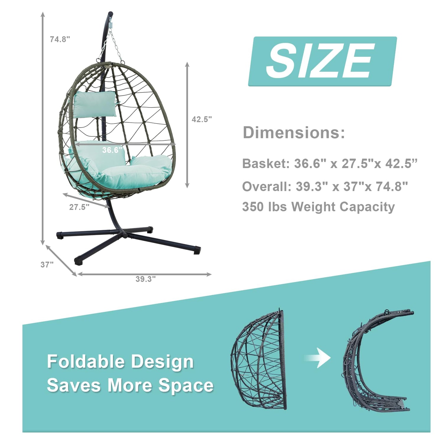 Egg Chair Indoor Outdoor, Foldable Hanging Egg Chair with Stand, Patio Swing Egg Chairs, UV Resistant Removable &Washable Thicken Padded Cushions, 350LBS Capacity for Bedroom, Balcony Blue
