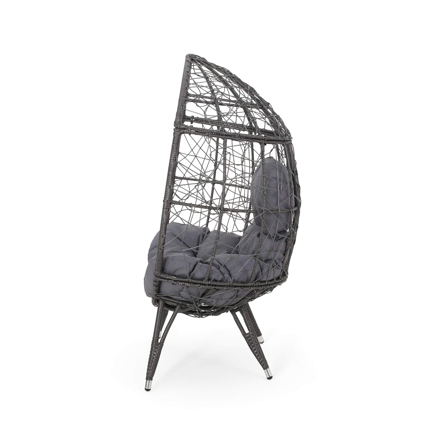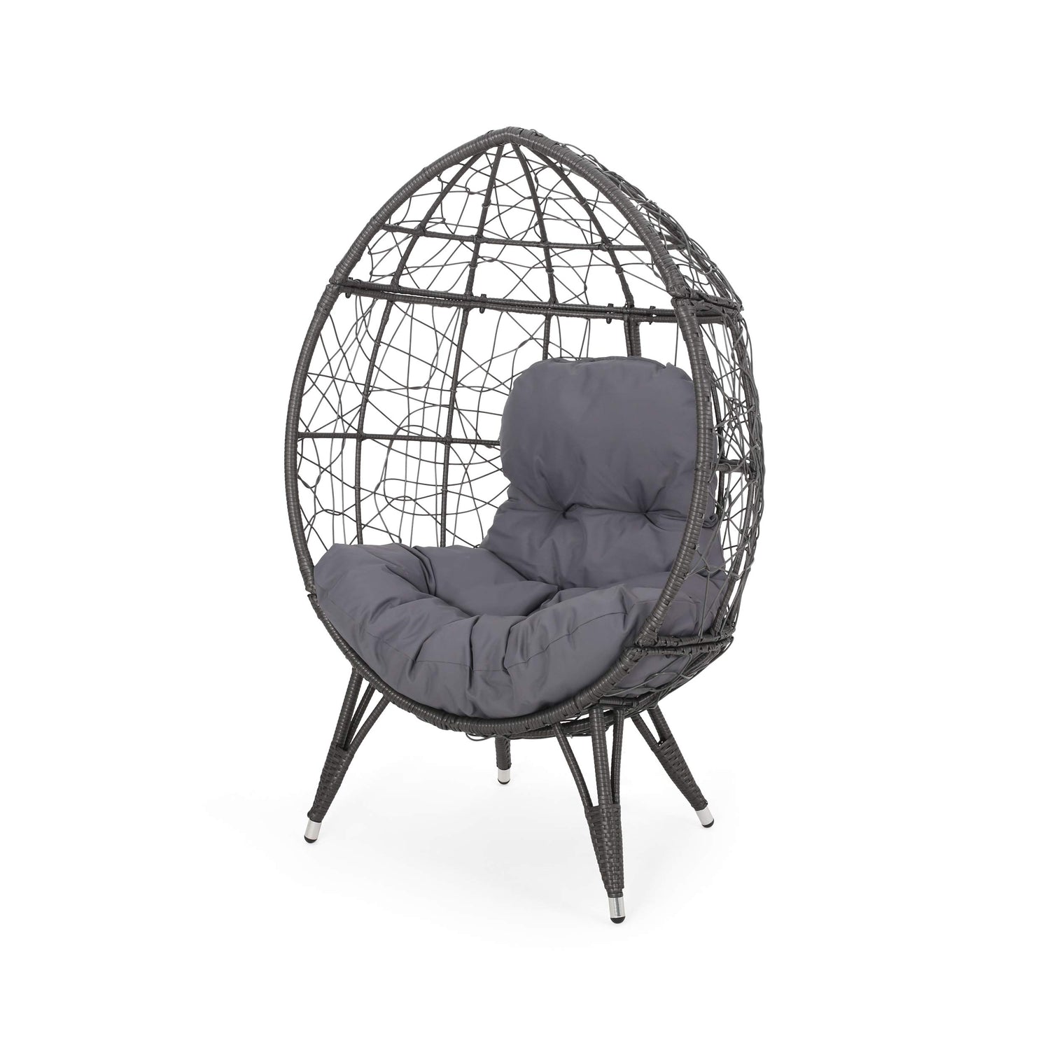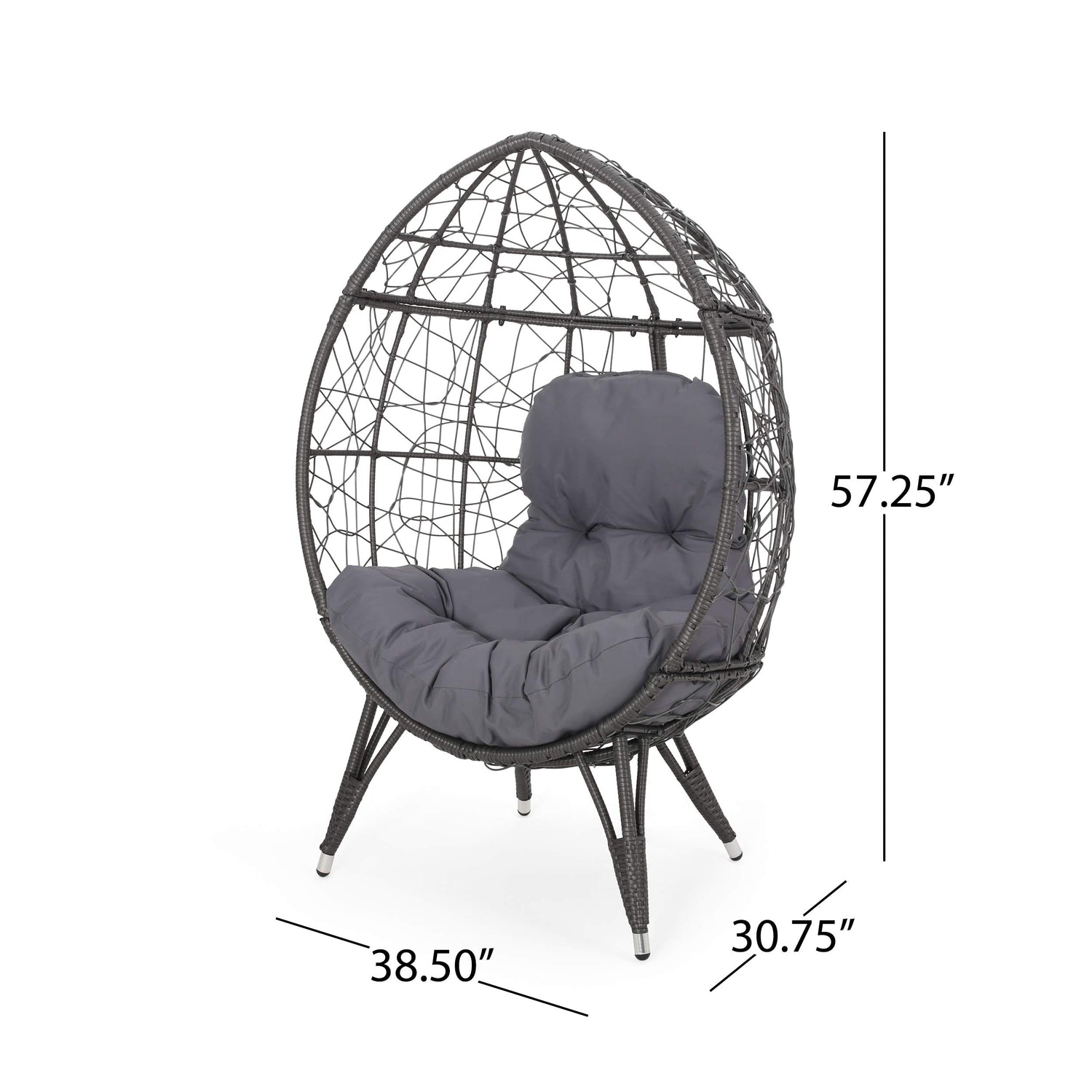 Details: Give your backyard space a flawless touch and an artistic flair by bringing home our exquisitely designed chair. Featuring a gorgeous teardrop shape and intricate abstract design, our outdoor chair not only gives your patio a modern look but also offers incredible comfort. This is constructed with beautifully wrapped wicker with a sturdy metal frame, allowing you hours of relaxation whenever you need it. Finished with plush water-resistant cushions, this piece is a truly extraordinary addition to your summer lounging. Includes: One (1) Teardrop Chair Material: Faux Rattan Frame Material: Iron Cushion Material: Water Resistant Fabric Cushion Composition: 100% Polyester Rattan Finish: Gray Cushion Color: Dark Gray Hand-Crafted Details Assembly Required Dimensions: 30.75 inches deep x 38.50 inches wide x 57.25 inches high.