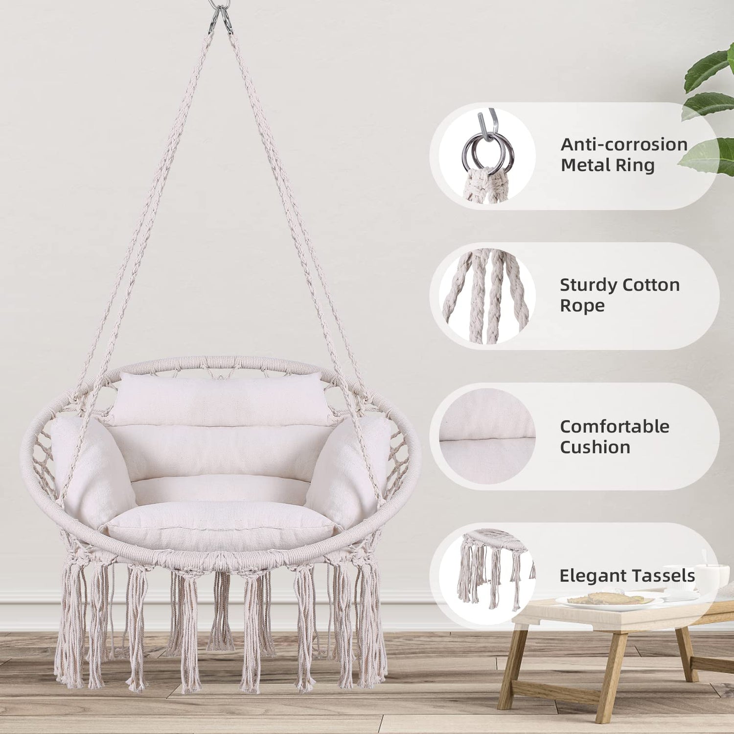 Goutime Hammock Chair, Macrame Hanging Swing Chairs with Cushion and Hardware Kit,Adult Boho Swings for Outside,Patio,Balcony,Bedroom (Beige)
