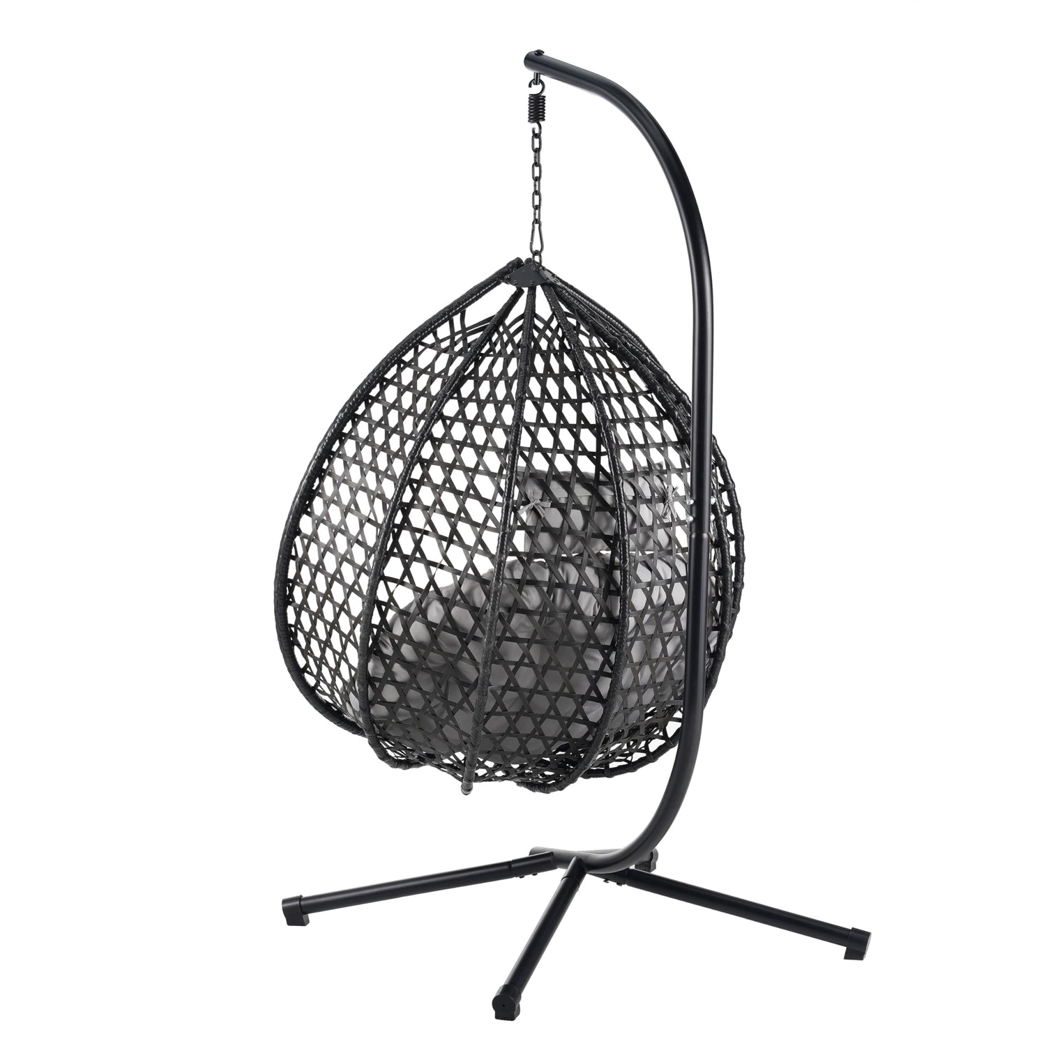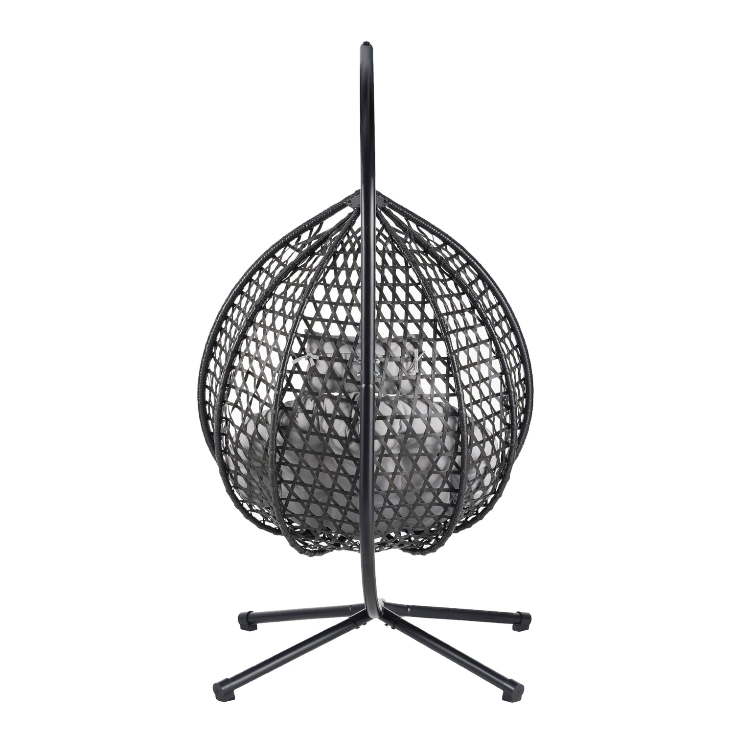 Hanging Egg Chair with Stand, Patio Rattan Wicker Patio Basket Hanging Chair, Garden Rattan Swing Hammock Chairs for Outside Balcony, Porch, Poolside, Indoor Outdoor, 330lbs Capacity, Black+ Grey