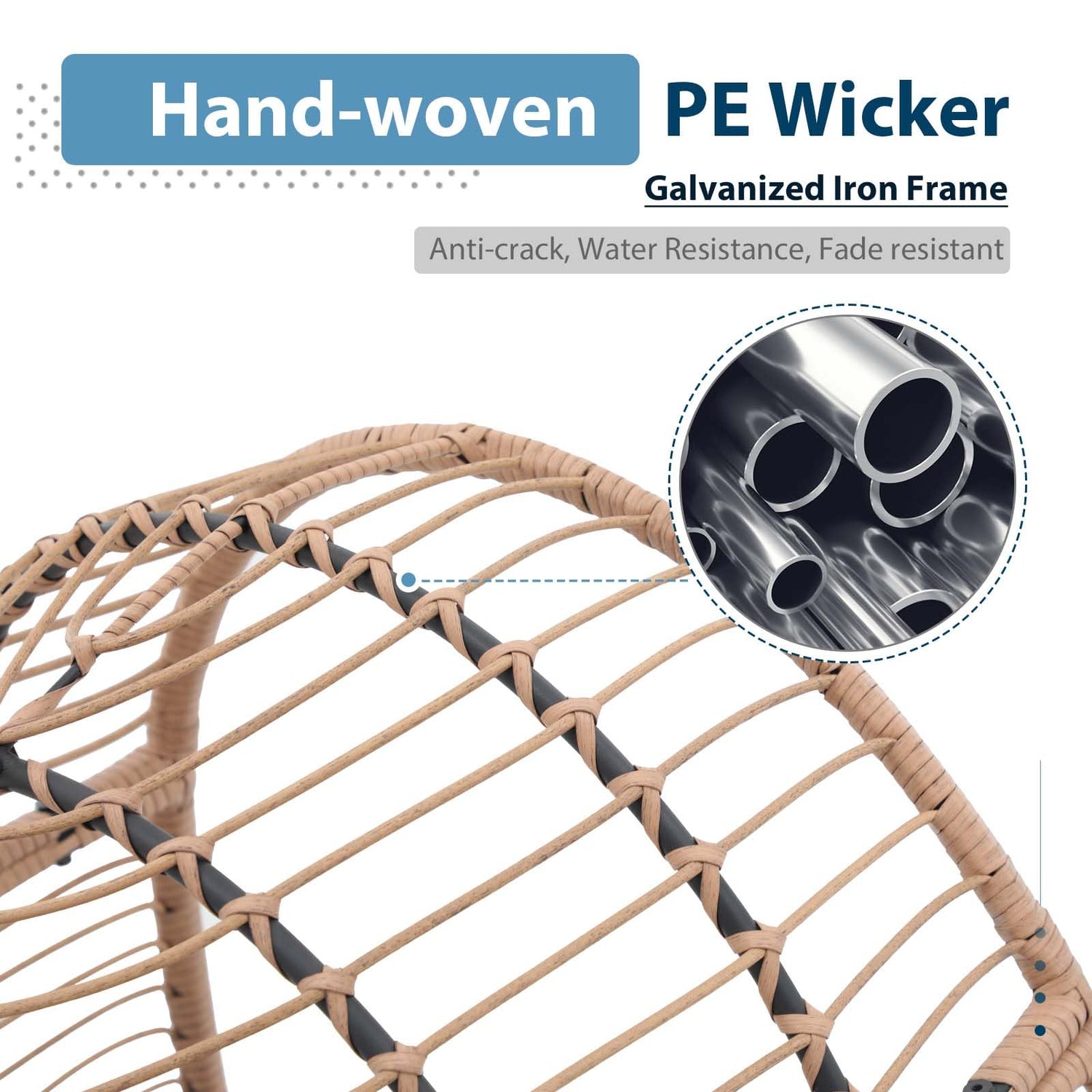 - All-Weather PE Wicker: This egg chair is made of hand-woven PE rattan, featuring sturdy, crack-resistant, fade-resistant, easy to clean and smooth to the touch. You can use this rattan chair for years to come