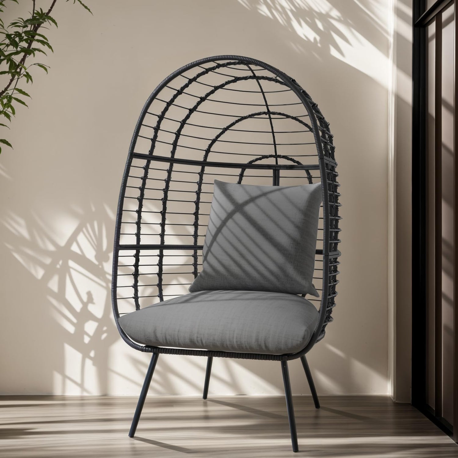 JOIVI Wicker Egg Chair, Oversized Indoor Outdoor Lounger Large Egg Basket Chair with Stand and Cushions for Patio Porch, Backyard, Living Room, Balcony (Black Rattan, Gray Cushion)