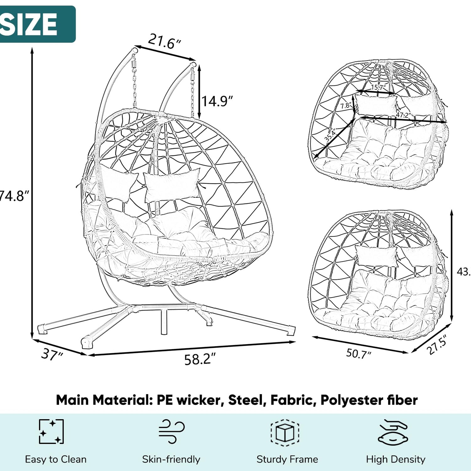 - DIMENSIONS: 59"(W) x 37"(D) x 75"(H). Please refer to the Size Image for detailed dimensions. From your living space to the backyard, this oversized egg chair fits seamlessly into any setting. It's ideal for reading, relaxing, sunbathing, or even working
